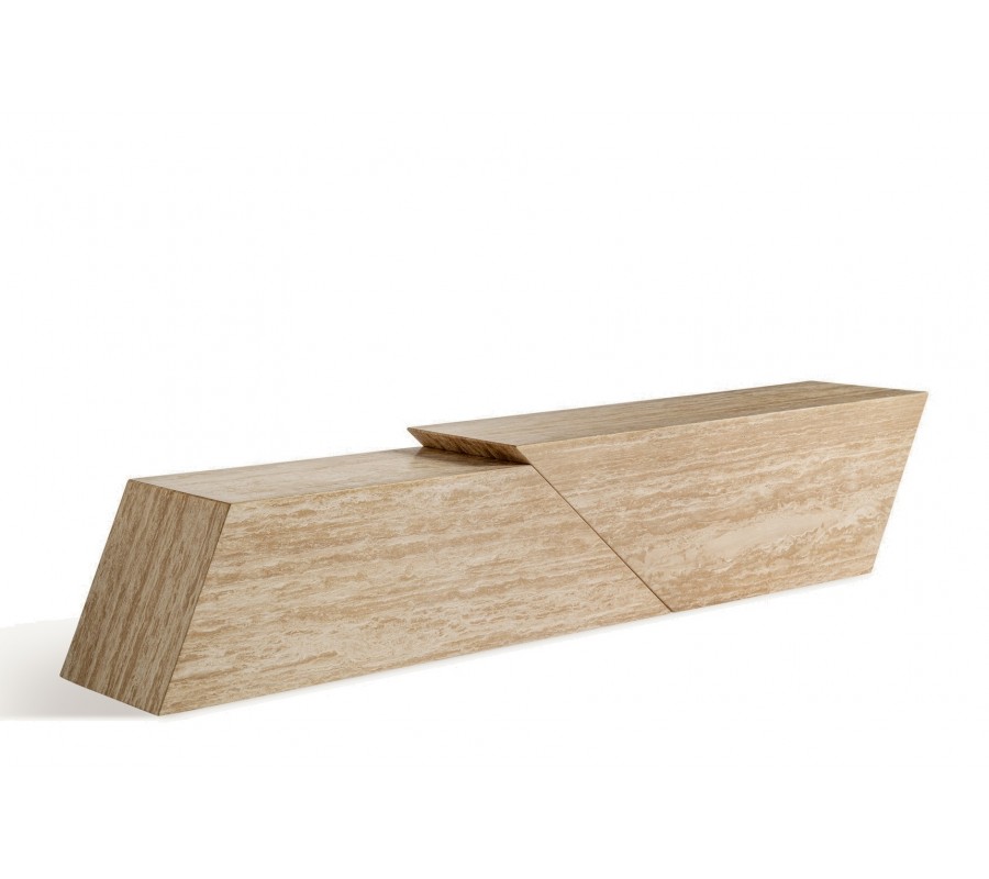 Luxusný art deco travertínový pieskovo krémový štruktúrovaný TV stolík Lorisa v atypickom kosoštvorcovom tvare 230 cm