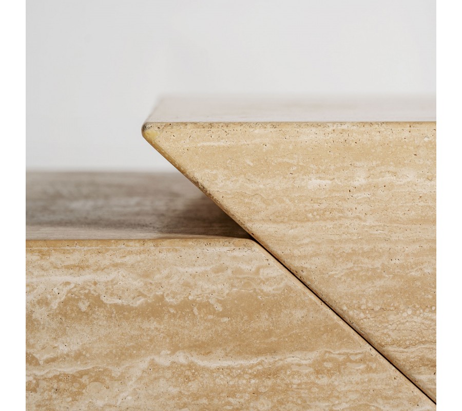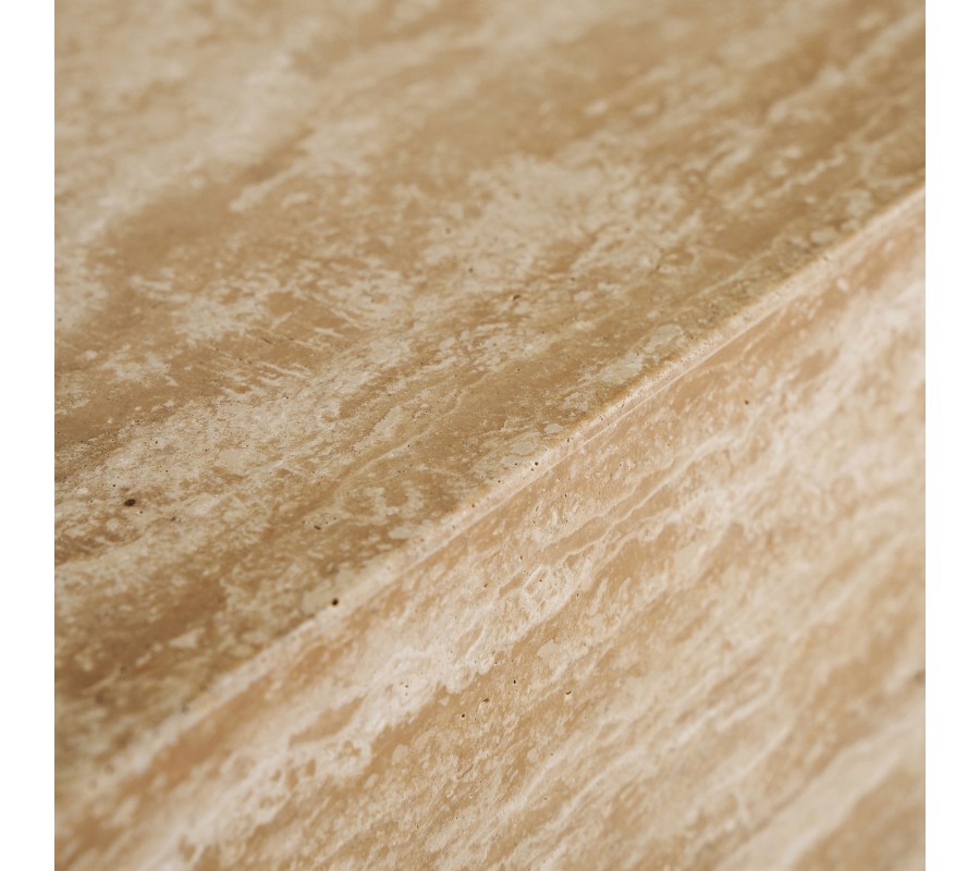 Luxusný TV stolík Lorisa v art deco štýle je vyrobený z prírodného travertínu v pieskovo-krémovej farbe, pričom jeho prirodzená kresba kameňa vytvára jedinečné vizuálne prechody medzi teplými odtieňmi a jemnými textúrami. Dizajn stolíka sa vyznačuje netradičným geometrickým riešením, kde je jeho konštrukcia rozdelená na dve asymetrické časti, pričom jedna z nich je mierne vyvýšená, čo dodáva nábytku dynamiku a architektonickú zaujímavosť.
