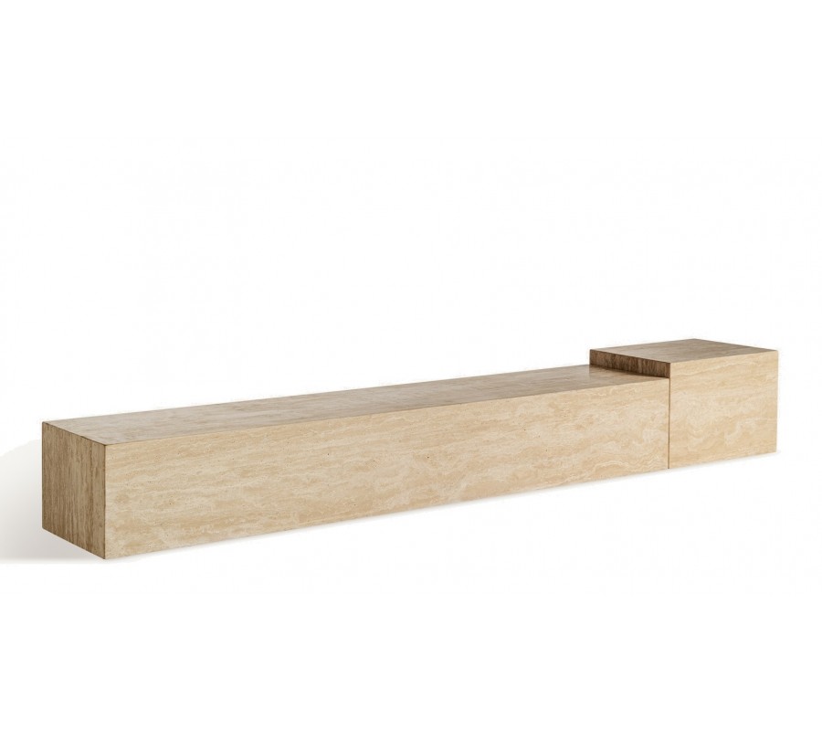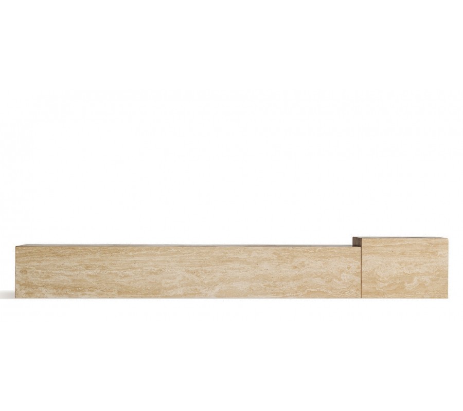 Precízne spracované rovné línie a hladký povrch podčiarkujú minimalistický a moderný charakter tohto dizajnového kúsku, zatiaľ čo štruktúra travertínu mu dodáva prirodzenú eleganciu. Svetlé pieskové odtiene travertínu sa vďaka svojej jemnej farebnej variabilite hodia do luxusných interiérov ladených v neutrálnych alebo zemitých tónoch.