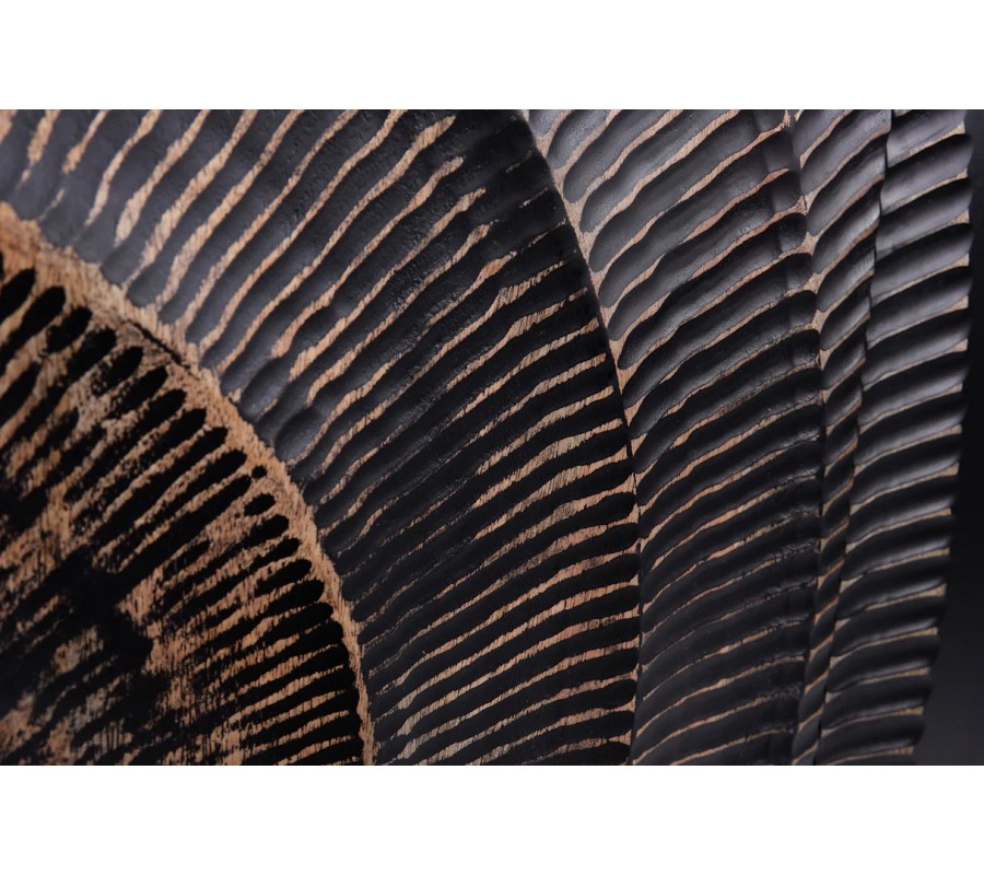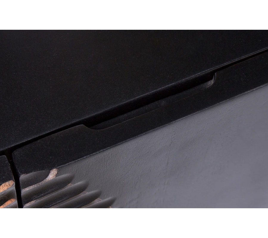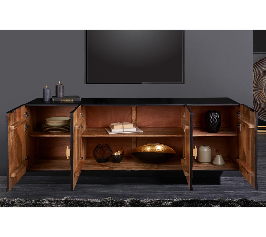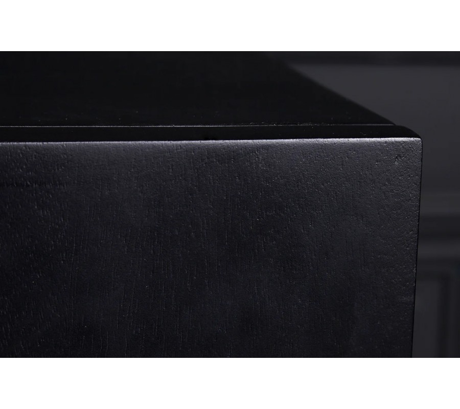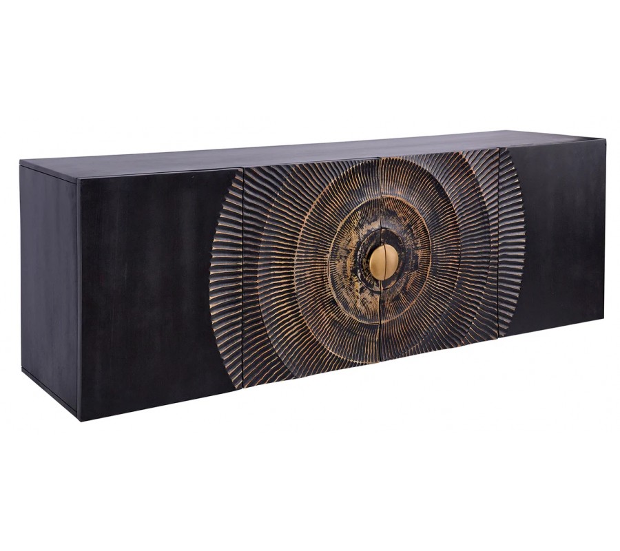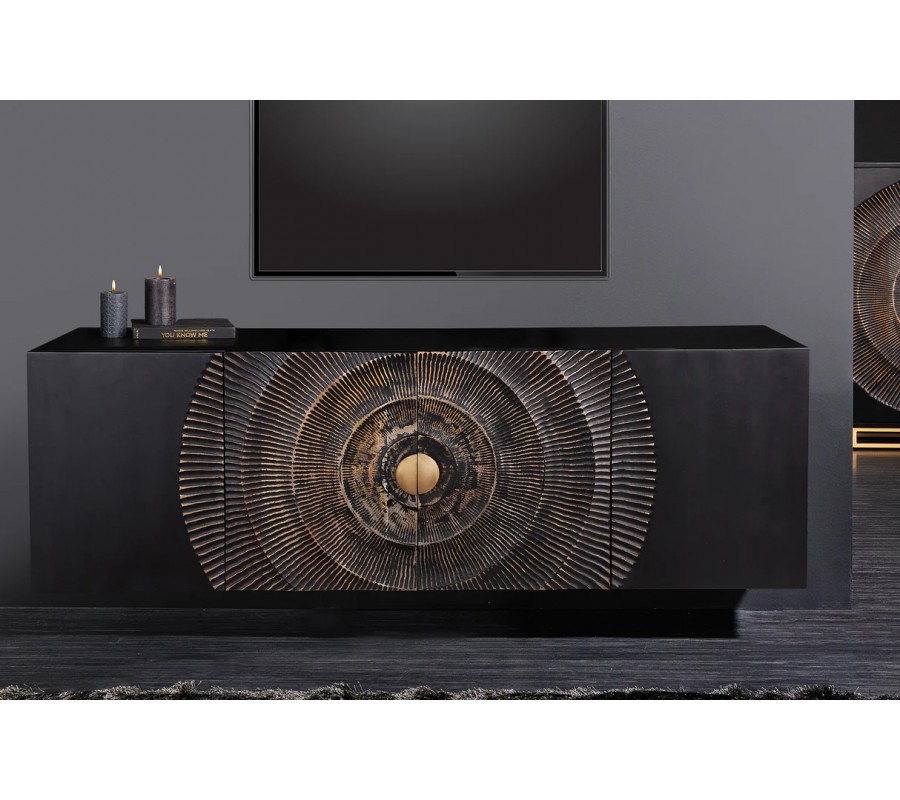Dizajnový art deco štvordverový televízny stolík Marlon predstavuje mimoriadne elegantný a výrazný prvok do luxusného interiéru. Vyhotovený je z masívneho mangového dreva v čiernej farbe s výraznou prirodzenou kresbou, ktorá jemne kontrastuje s vyrezávaným kruhovým vzorom na predných dvierkach.