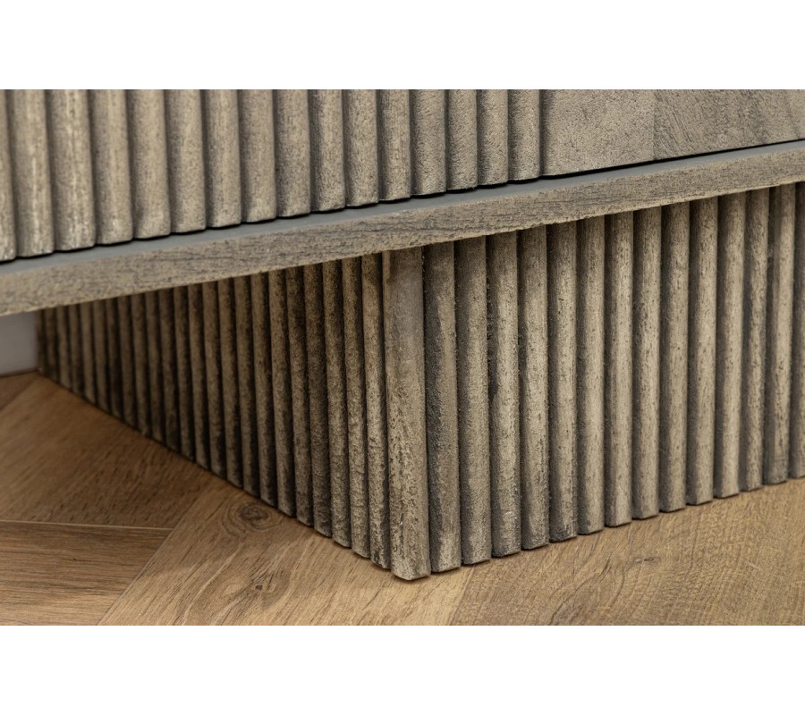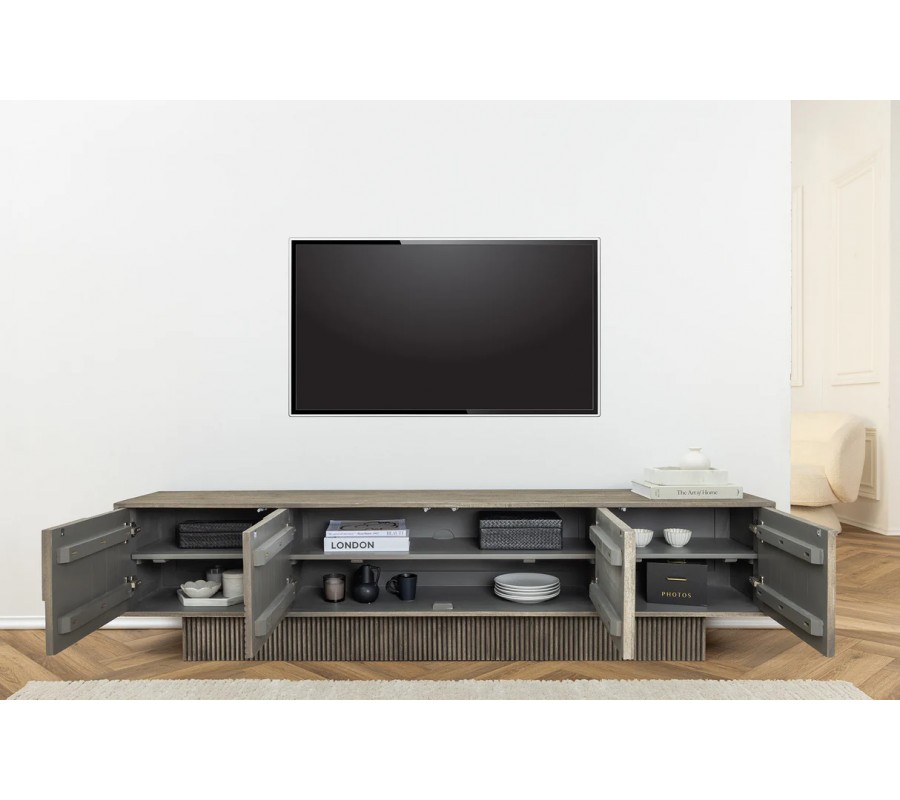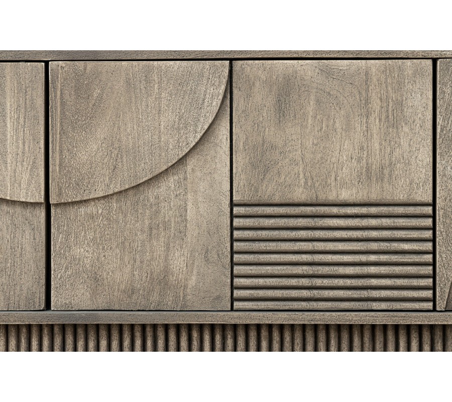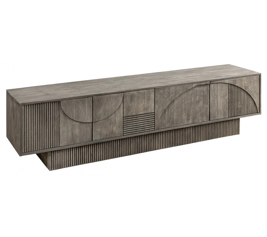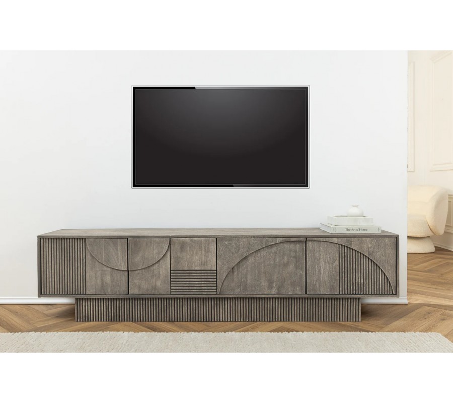 Dizajnový art deco obdĺžnikový TV stolík Sonia zo sivého mangového dreva so štyrmi dvierkami s geometrickým reliéfom 200 cm