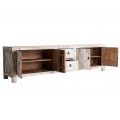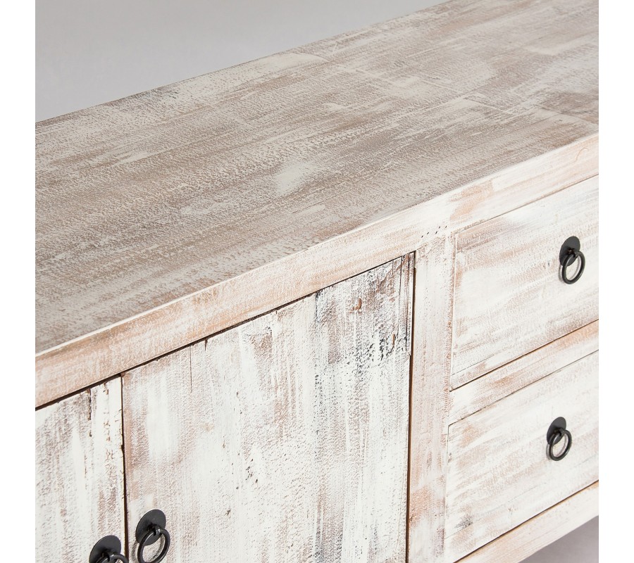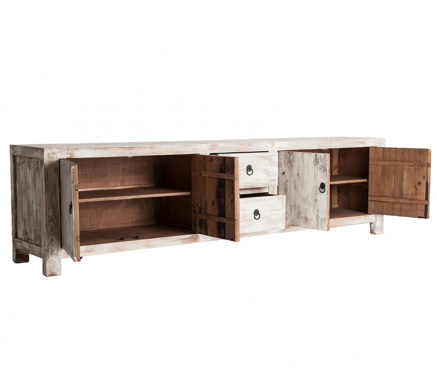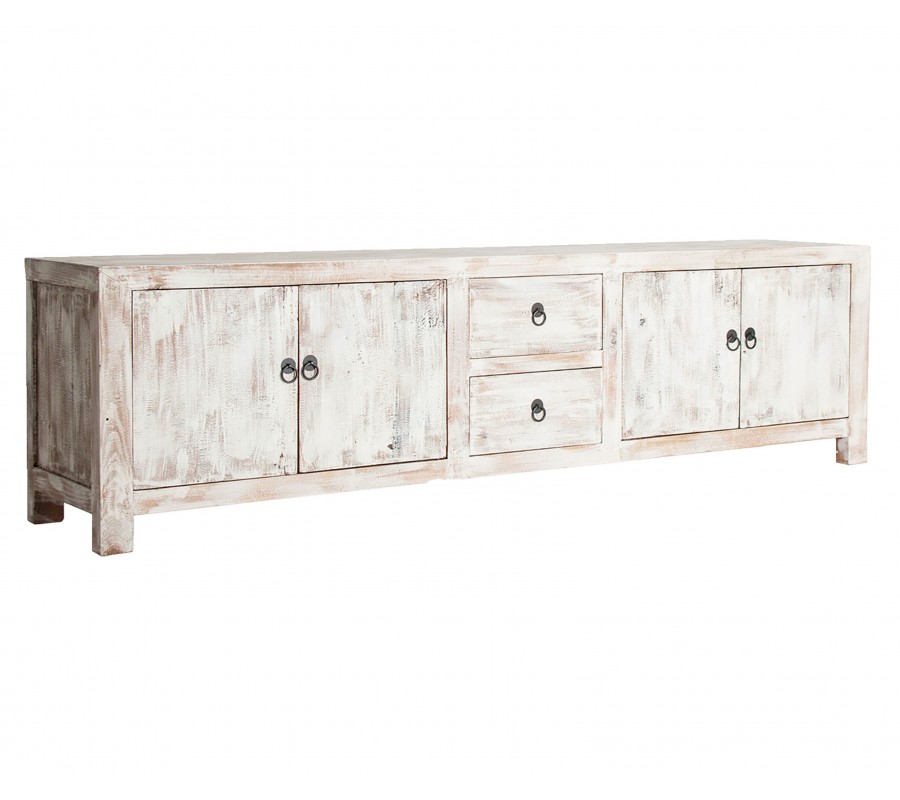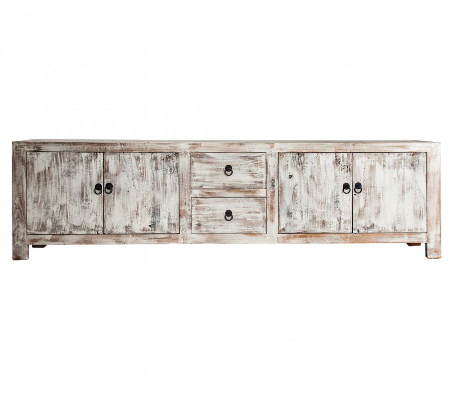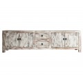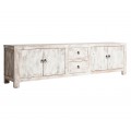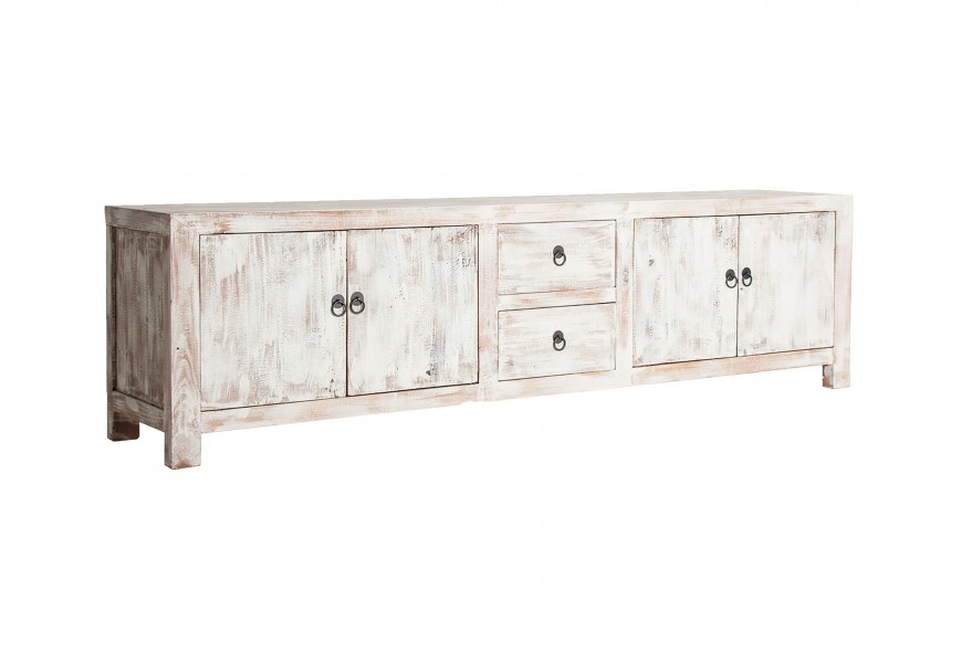 Luxusný provensálsky TV stolík Levana z masívneho dreva s bielou patinou s dvomi zásuvkami s čiernymi úchytkami 220 cm