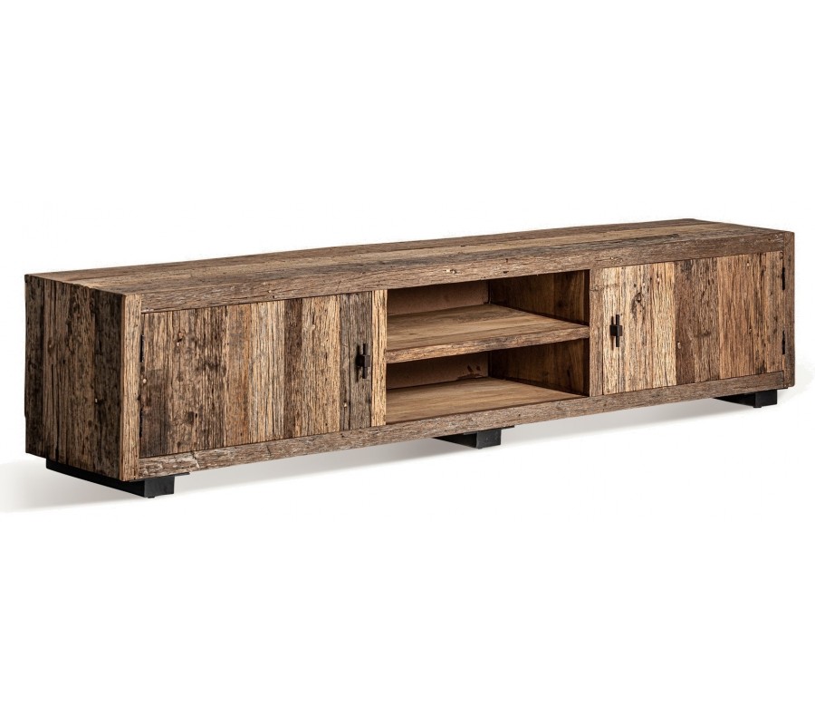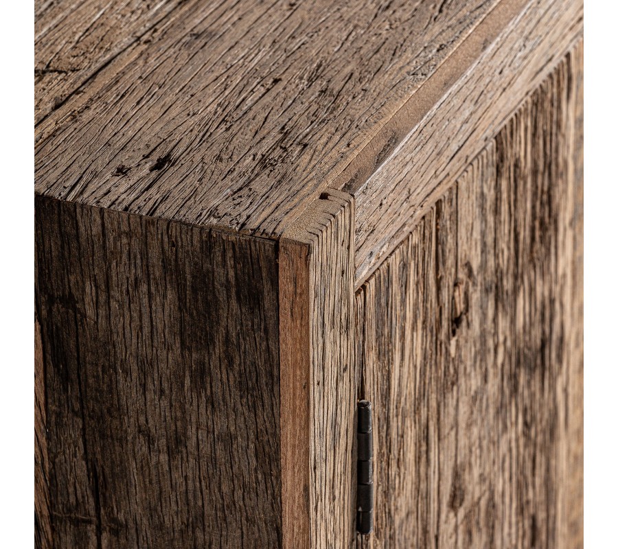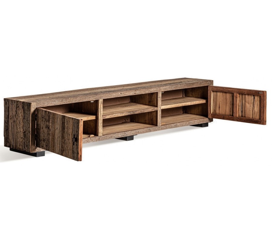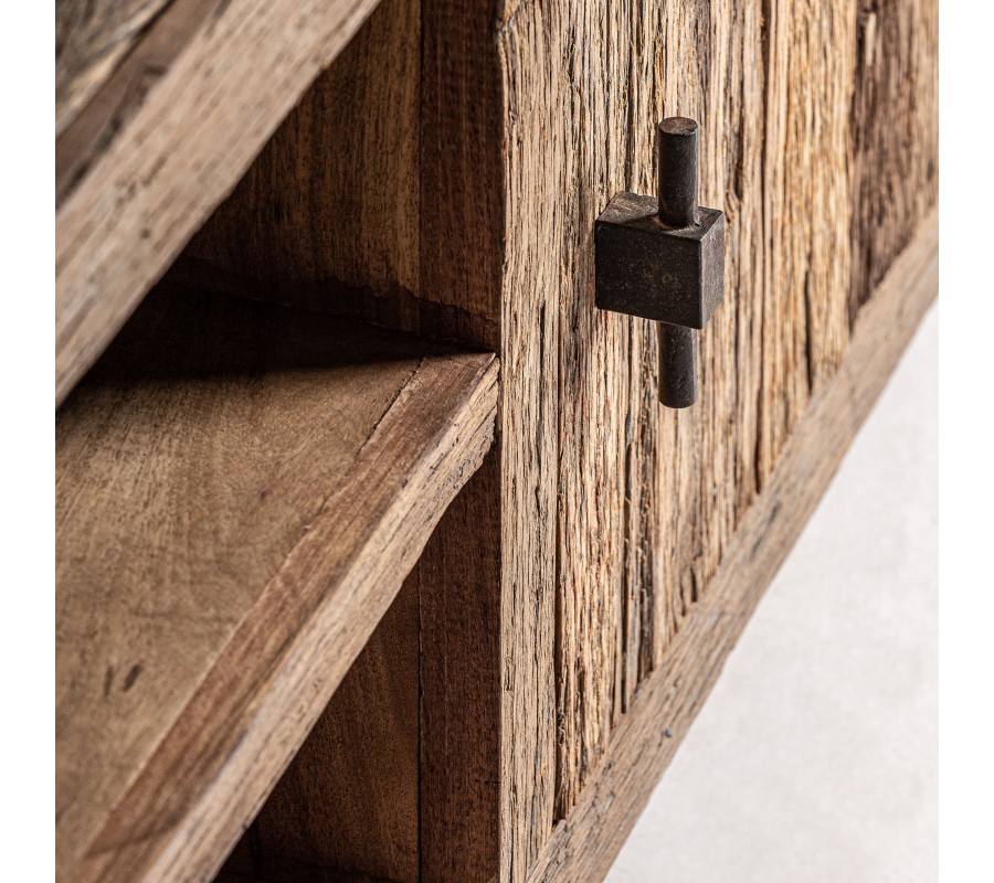 Úložný priestor je prakticky členený do stredovej otvorenej sekcie s dvomi poličkami a bočných uzatvárateľných skriniek, ktoré sú vybavené dvomi dvierkami s rámovou konštrukciou z vnútornej strany. Tá zaručuje pevnosť a zároveň vytvára nápaditý detail v rustikálnom štýle. Vertikálne kovové úchytky v čiernej matnej povrchovej úprave tvoria ladný kontrast s masívnym drevom a zdôrazňujú industriálny charakter stolíka.