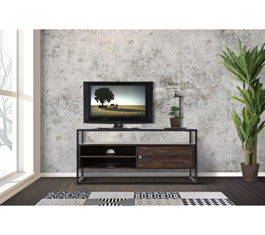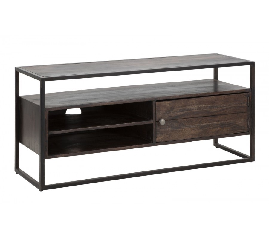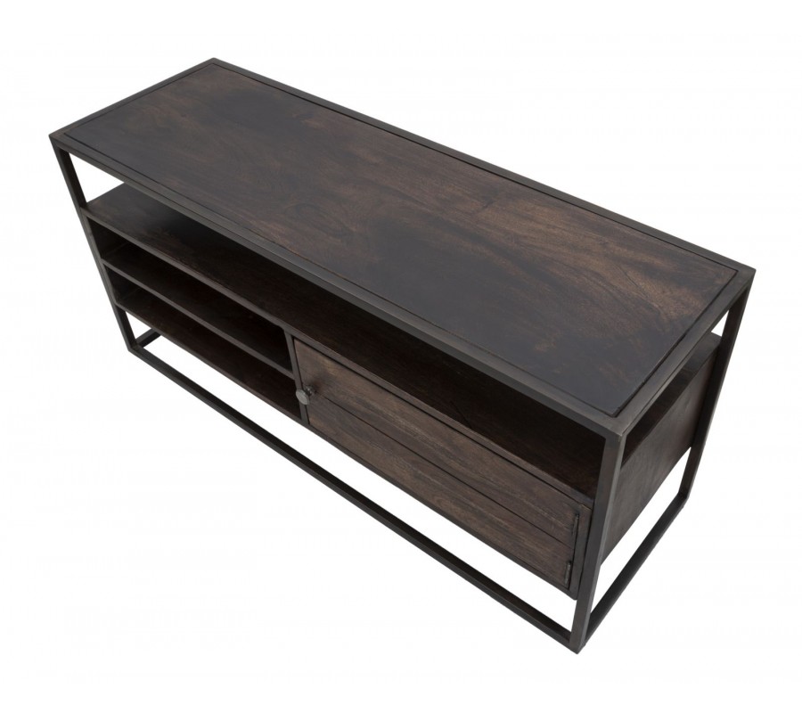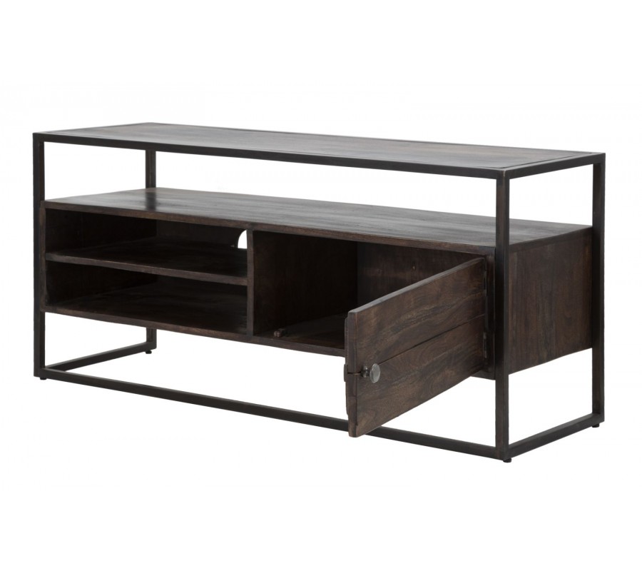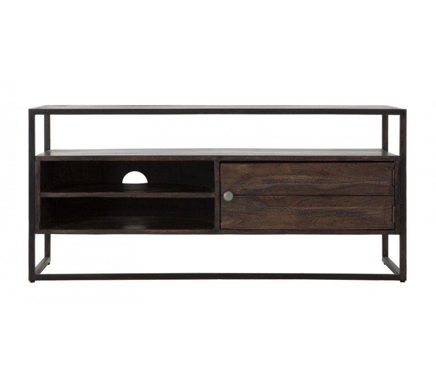 Dizajnový masívny TV stolík Melvin z akáciového dreva v tmavej hnedej farbe s tromi policami a jednými dvierkami 120 cm