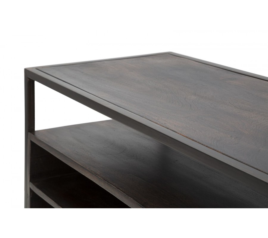 Konštrukcia je vyrobená z kovu v čiernej farbe. Náter je mierne patinovaný a tieto detaily pripomínajú hrdzu, čo podčiarkuje priemyselný vizuál nábytku. Úložný priestor a vrchná doska sú vyrobené z akáciového dreva, ktoré je mimoriadne pevné a odolné. Tmavé hnedé lakovanie zachováva naturálnu kresbu letokruhov a materiál tak pôsobí teplým dojmom.