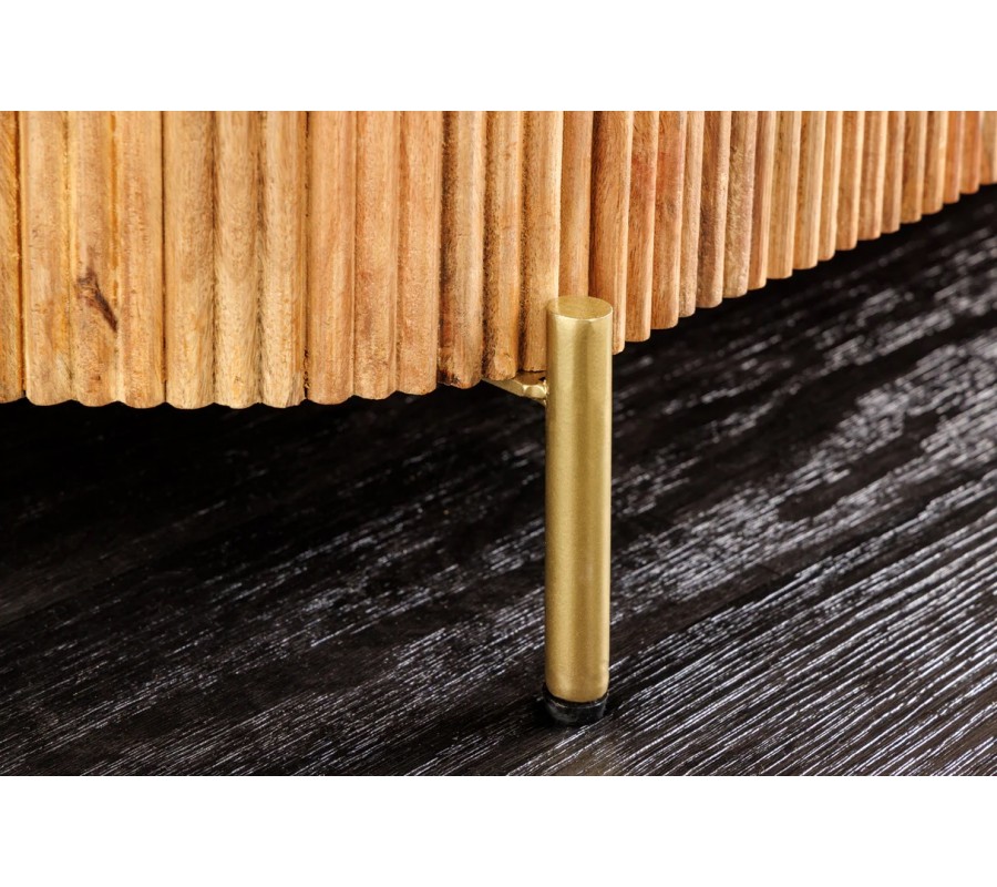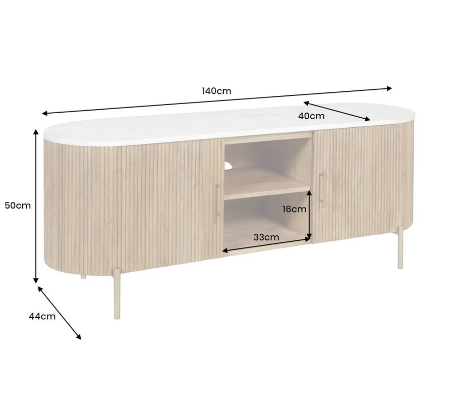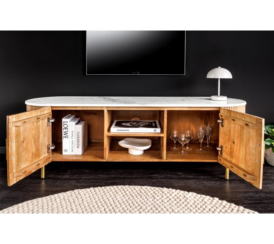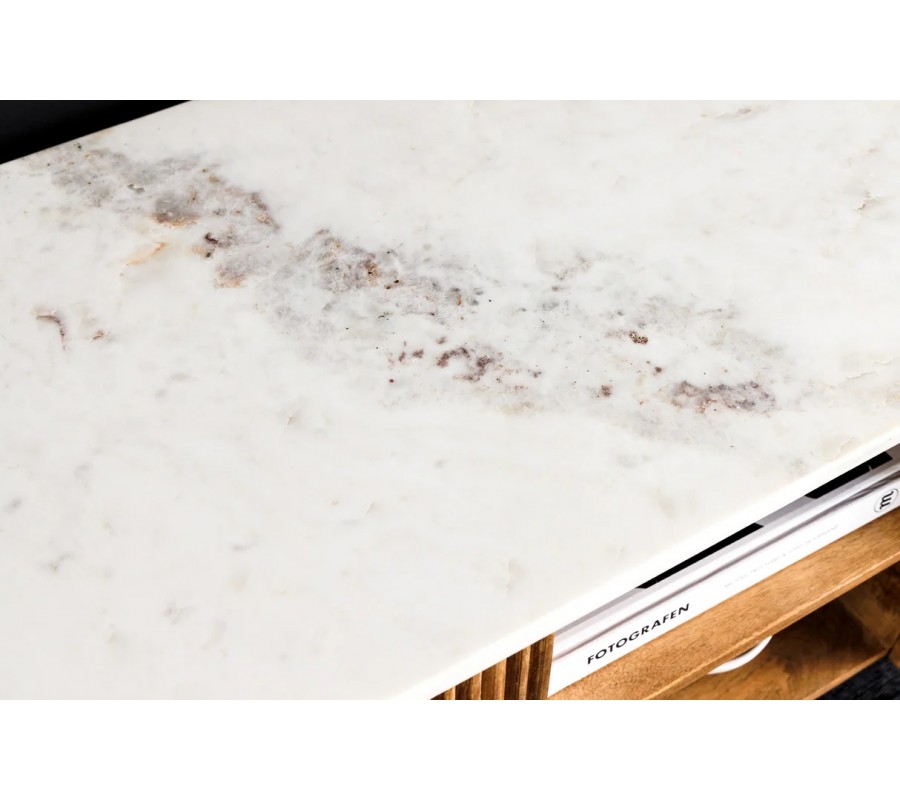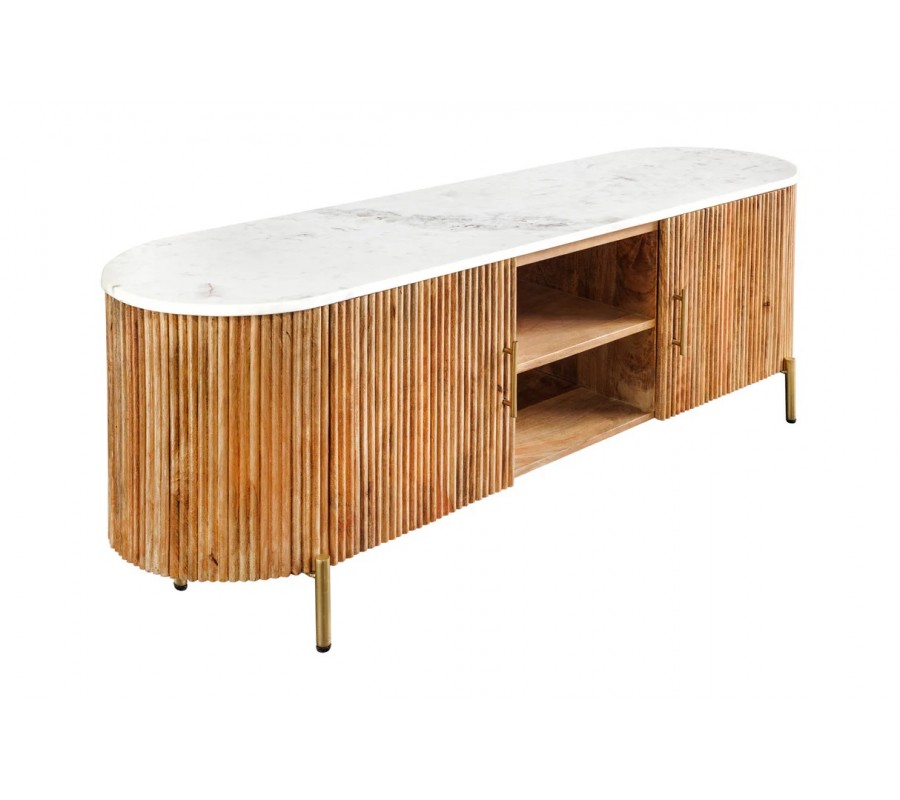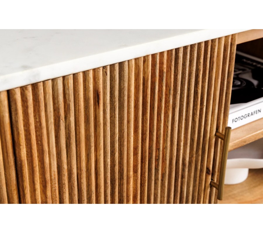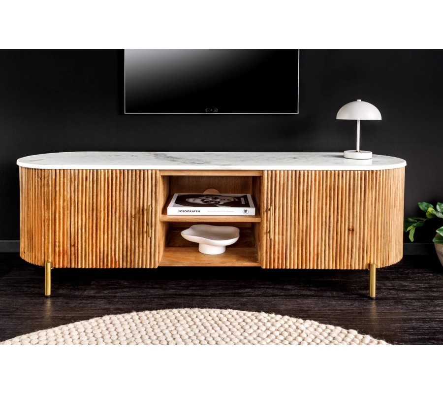 TV stolík Celestia v štýle art deco je luxusný a funkčný kúsok, ktorý elegantne doplní vašu obývaciu izbu. Jeho zaoblený tvar a oválna biela mramorová doska so sivými žilkami pôsobia vzdušne a ušľachtilo. Korpus z masívneho mangového dreva v prírodnej hnedej farbe zaujme vrúbkovaným vertikálnym povrchom, ktorý dodáva nábytku jedinečný charakter.