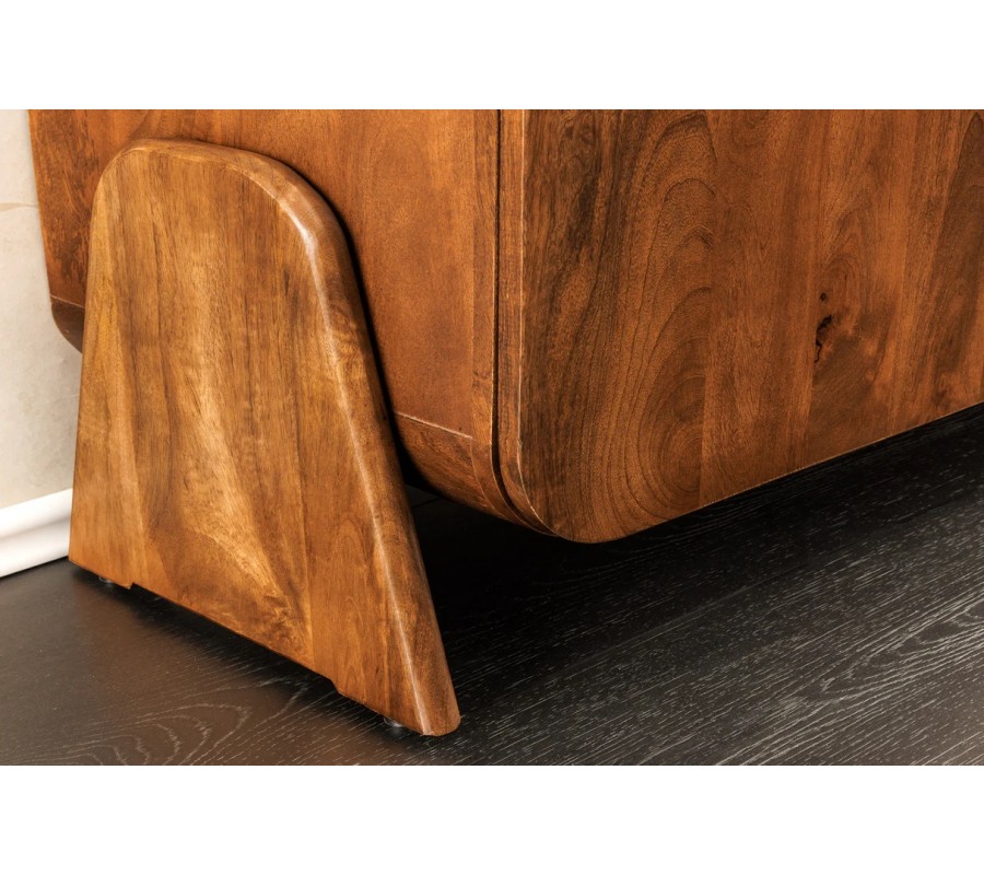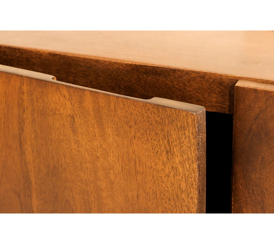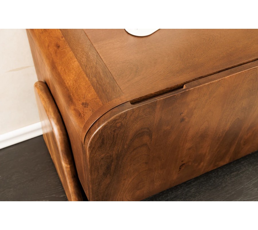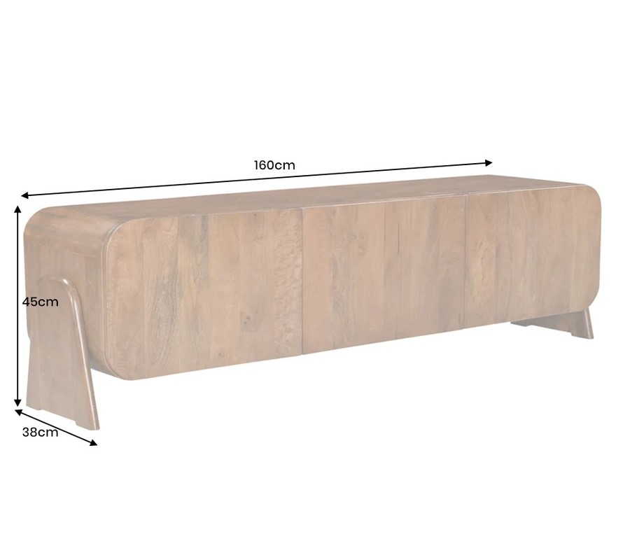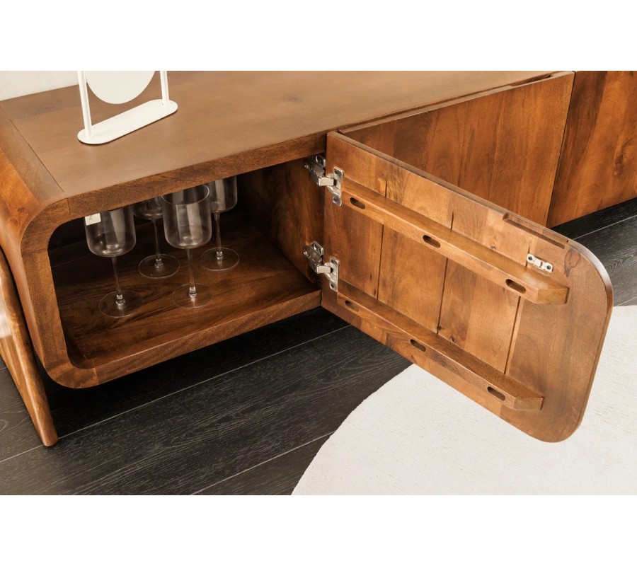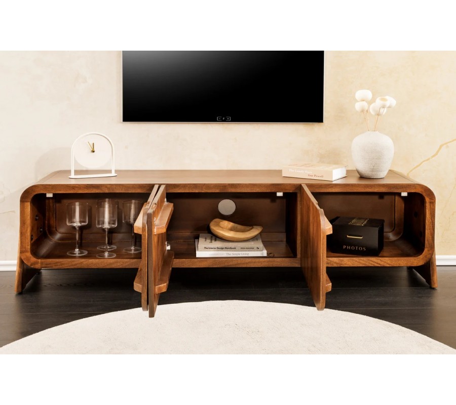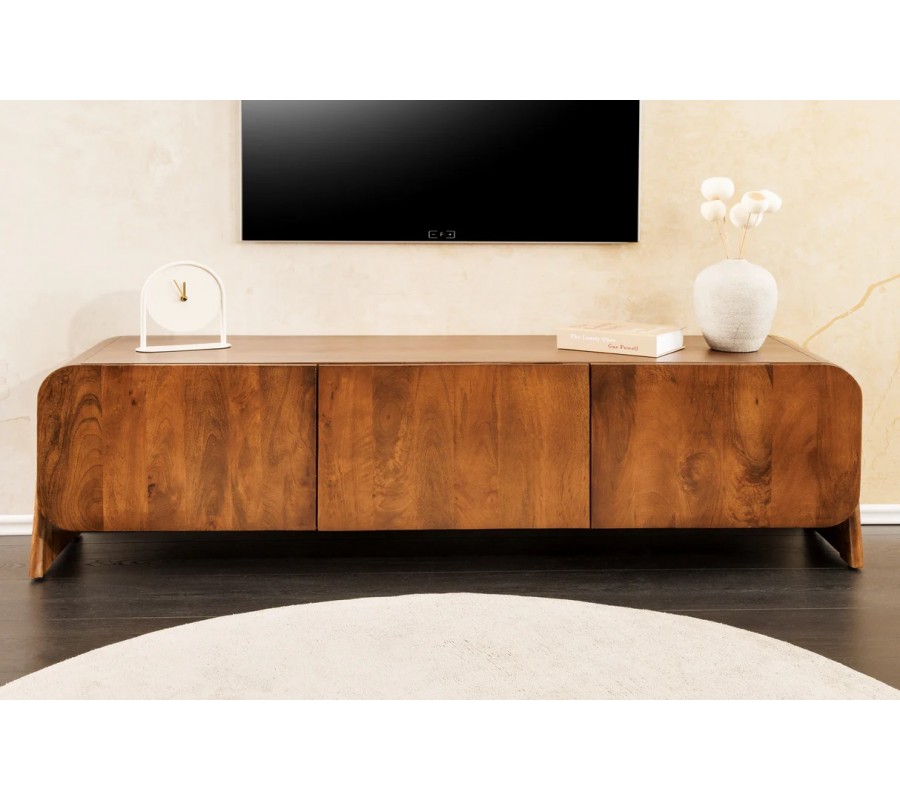 Vidiecky masívny obdĺžnikový trojdverový TV stolík Jakar z mangového dreva v hnedej farbe s oblými rohmi 160 cm