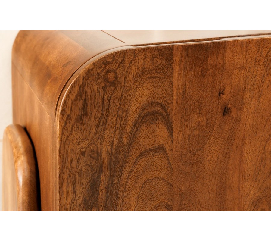 Masívny TV stolík Jakar v prírodnom vidieckom štýle je vyrobený z kvalitného mangového dreva v hnedej farbe s výraznou kresbou letokruhov. Jeho obdĺžnikový tvar dopĺňajú zaoblené rohy a hladký povrch, ktorý podčiarkuje remeselné spracovanie. Stolík stojí na dvoch plochých nožičkách v tvare zrezaného trojuholníka, ktoré mu dodávajú stabilitu a dizajnovú originalitu.