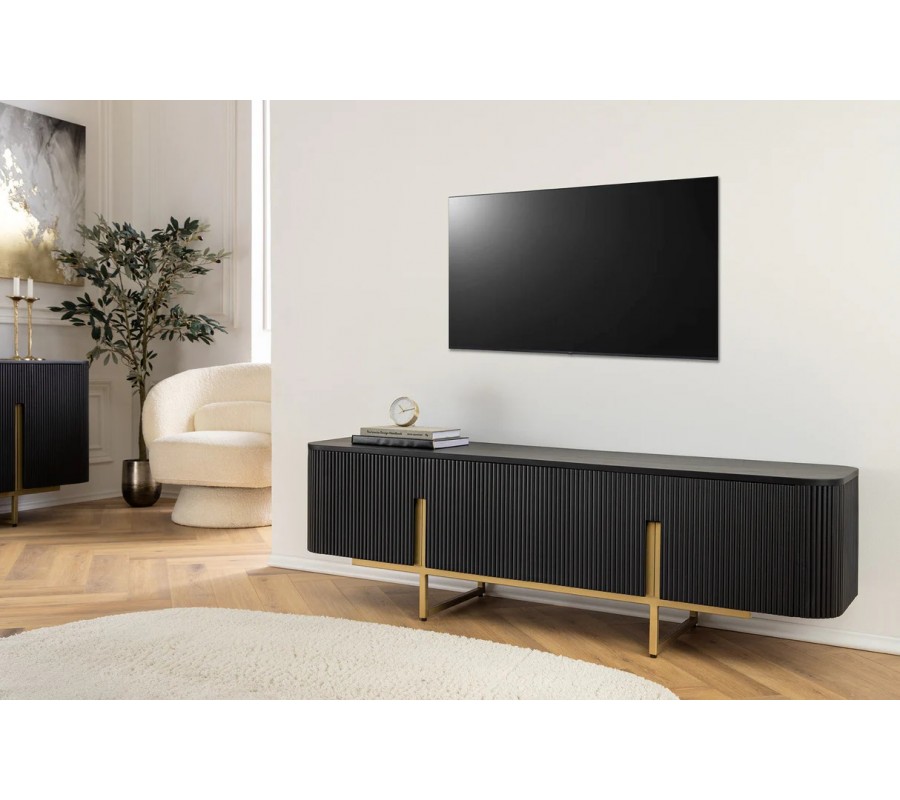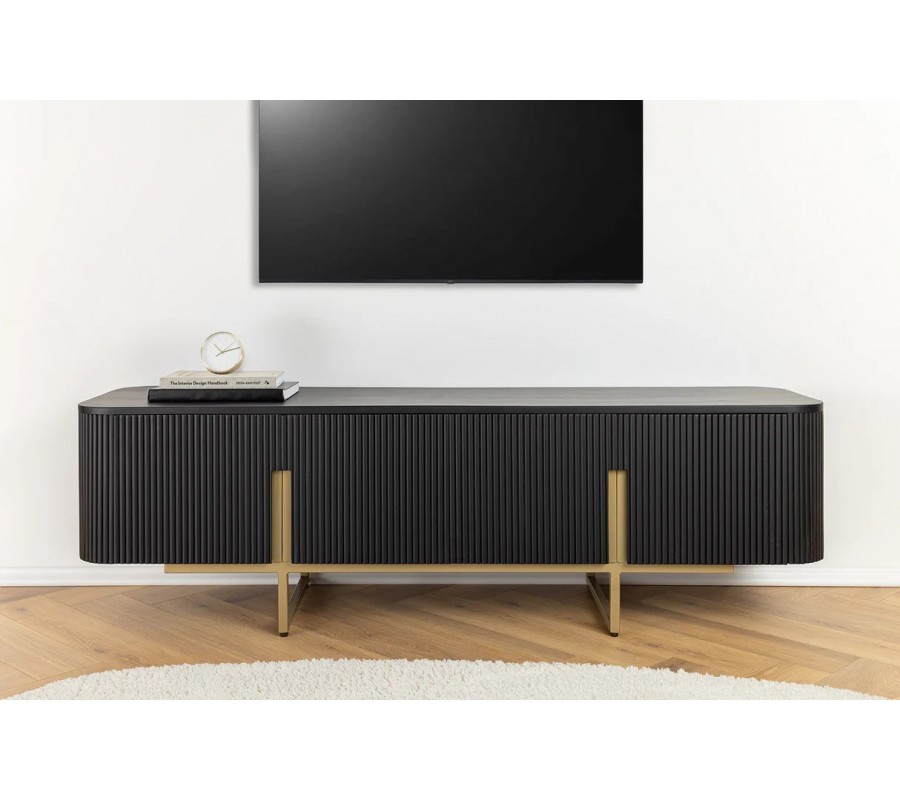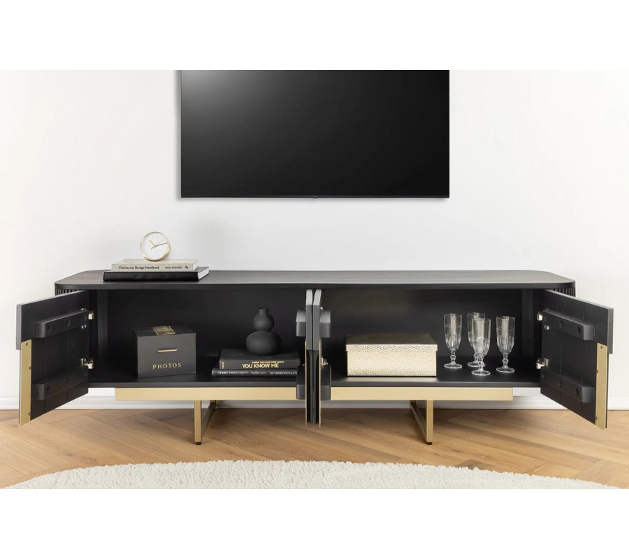 Art deco obdĺžnikový štvordverový TV stolík Gatsby z čierneho mangového dreva s lamelami so zlatými úchytkami a nožičkami 160 cm