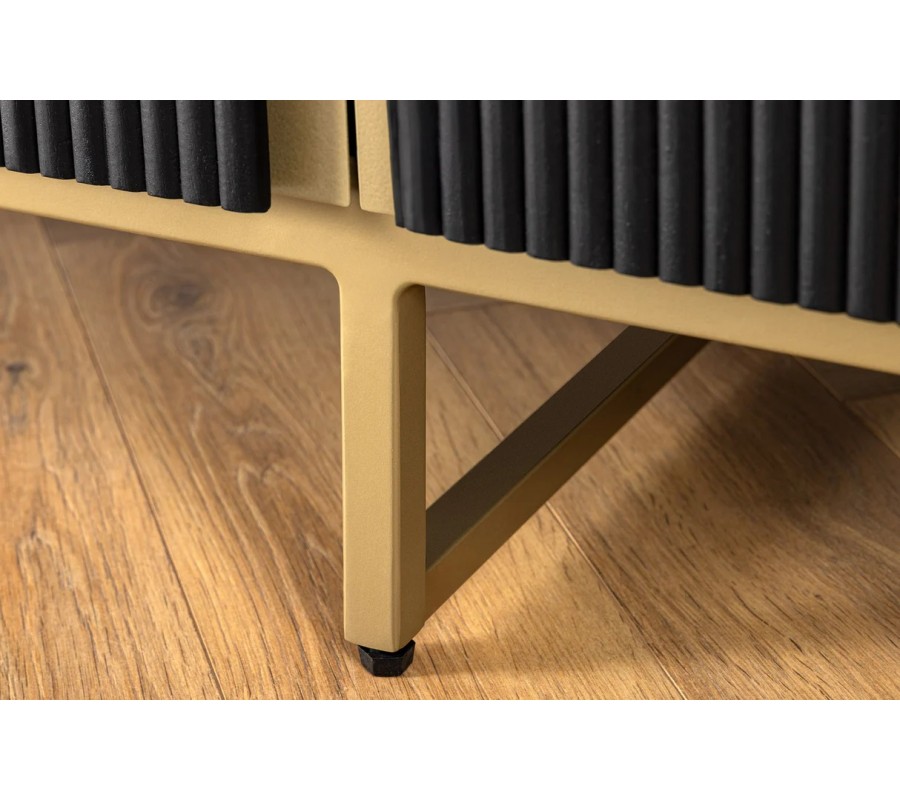 Stolík má štyri dvierka, vybavené štyrmi obdĺžnikovými kovovými úchytkami v zlatej farbe. Úchytky harmonicky ladia s nožičkami a tvarovo do nich plynulo prechádzajú, čím vytvárajú jednotný dizajnový celok. Vnútorný priestor je rozdelený na dve samostatné sekcie, ktoré poskytujú dostatok miesta na uskladnenie elektroniky, doplnkov alebo osobných predmetov.