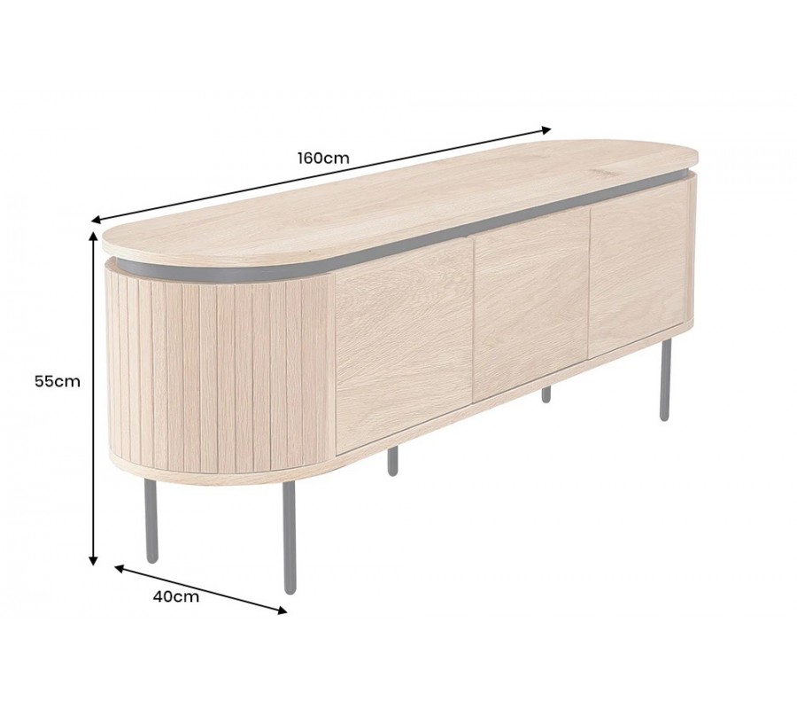Dizajnový oválny trojdverový TV stolík Maderia v naturálnom hnedom dubovom prevedení s lamelovým drážkovaním 160 cm