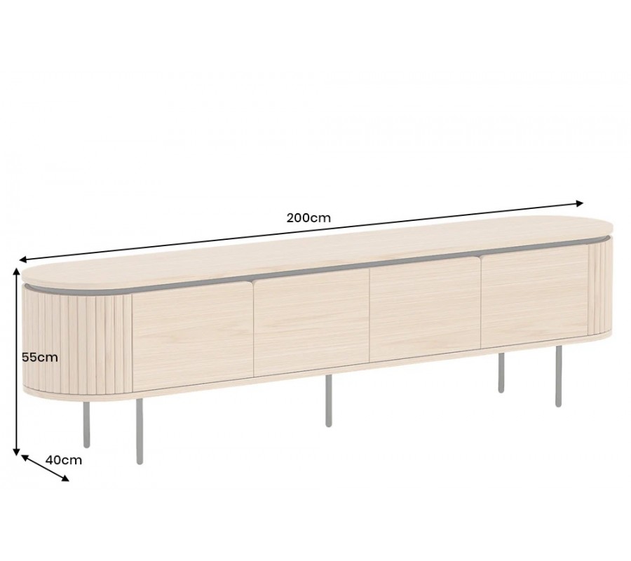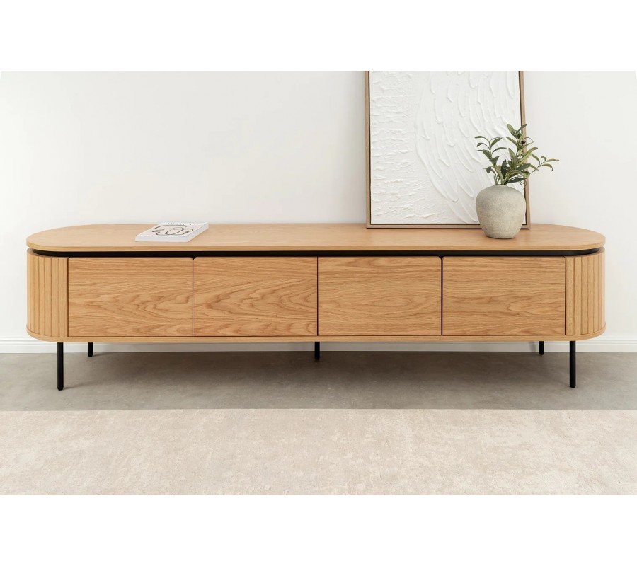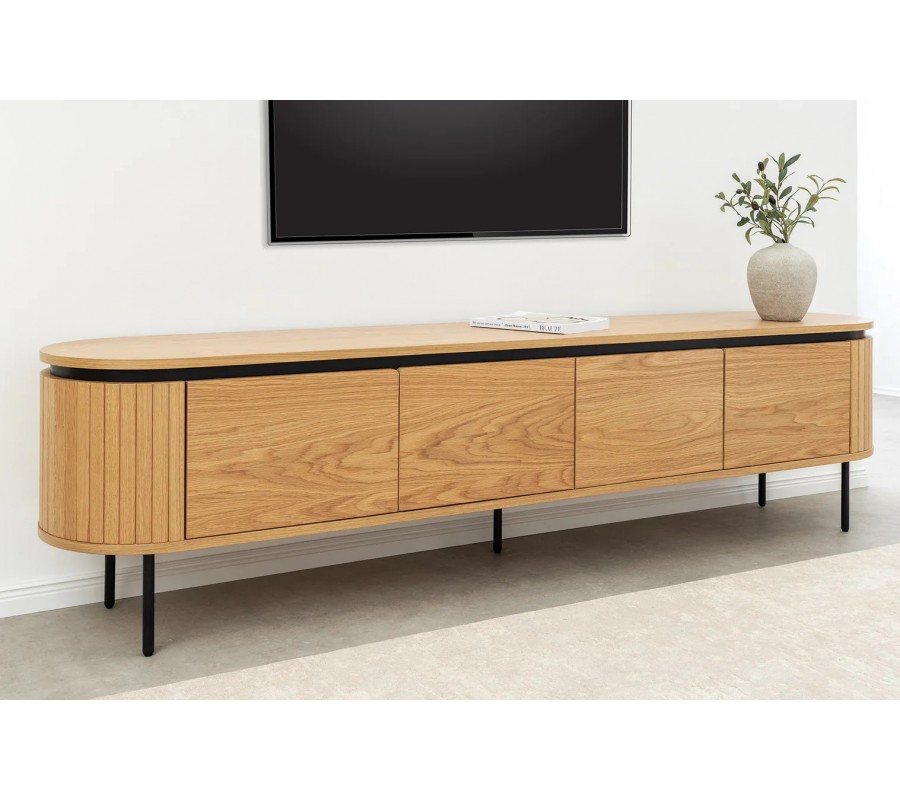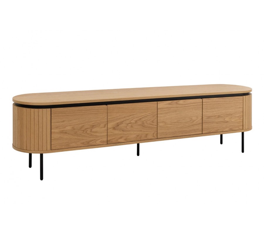 Moderný štvordverový TV stolík Maderia oválneho tvaru s lamelovým drážkovaním v hnedom dubovom prevedení 200 cm