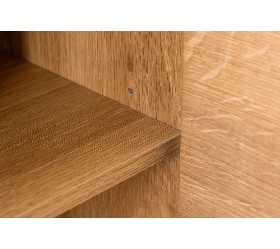 Úložný priestor pozostáva z dvoch dvojdverových skriniek. Ich interiér je predelený policou, čo maximalizuje jeho kapacitu. Dvierka majú magnetické zatváranie a modernú hladkú fasádu bez úchytiek. Zvyšný obvod dopĺňajú vertikálne lamely a ich pravidelný geometrický charakter dodáva nábytku art deco nádych.