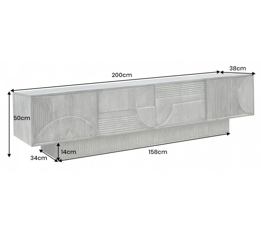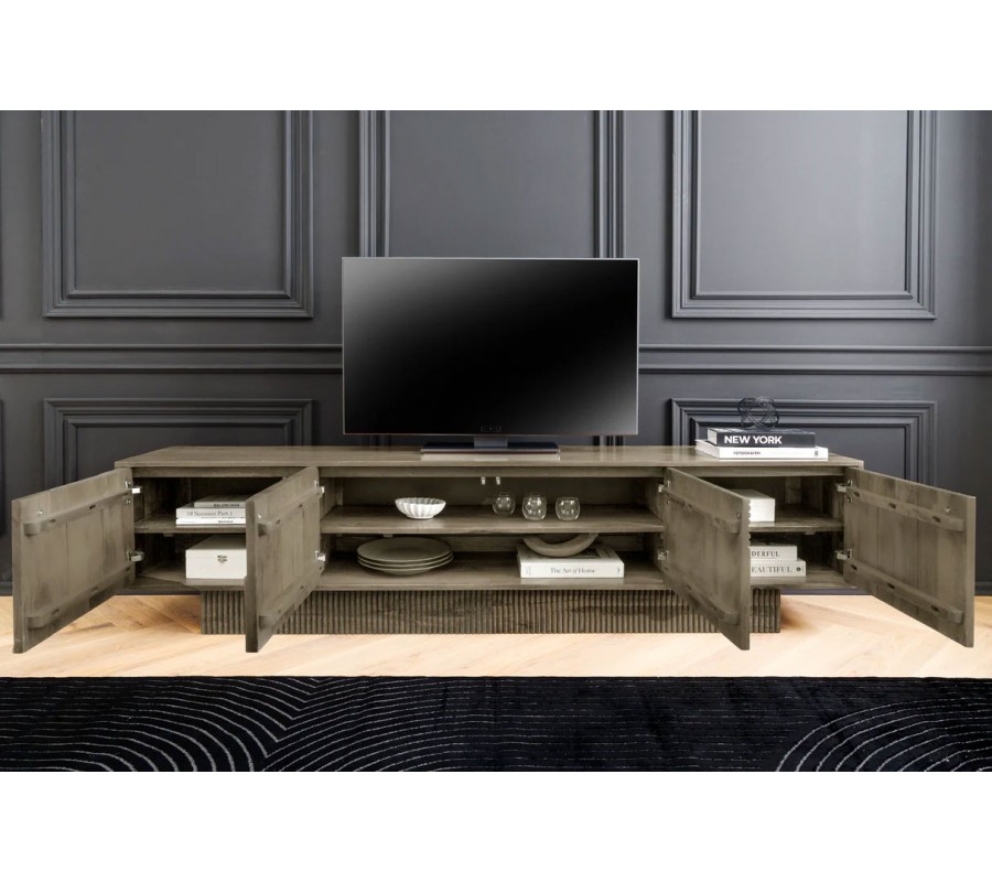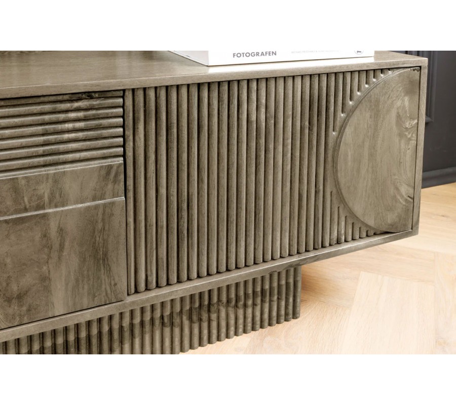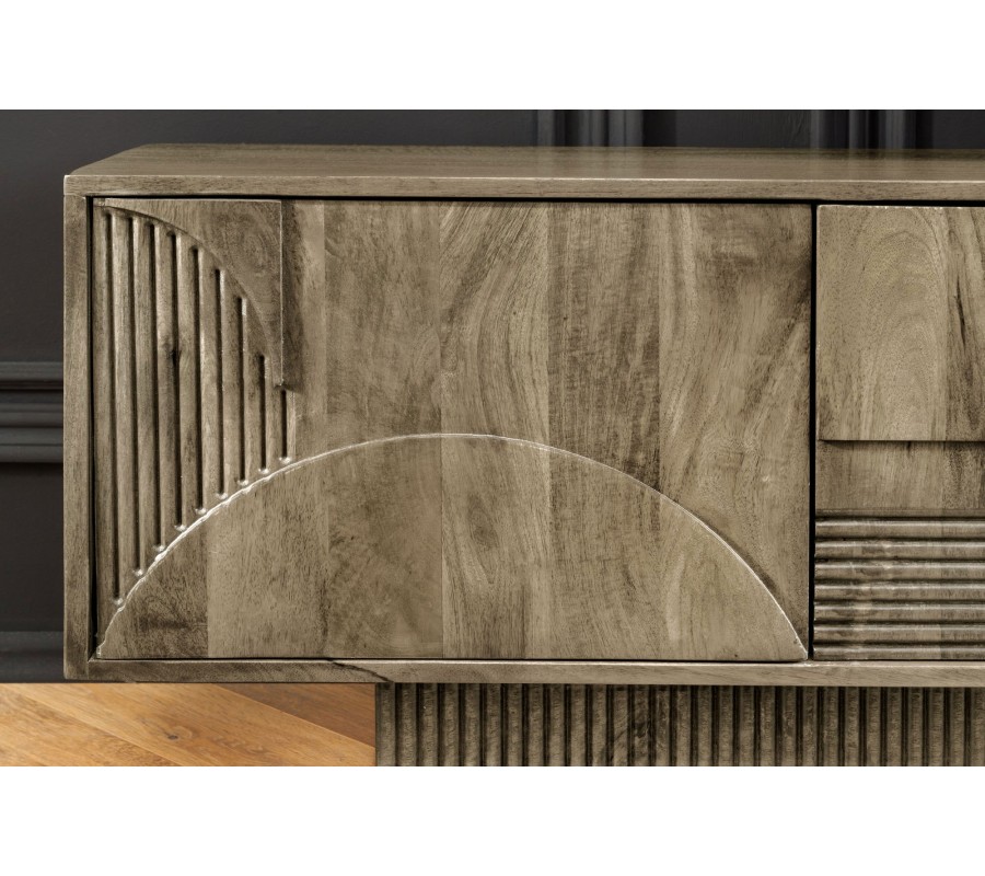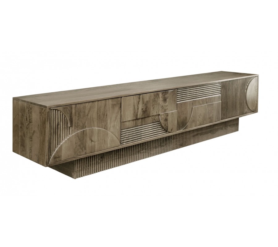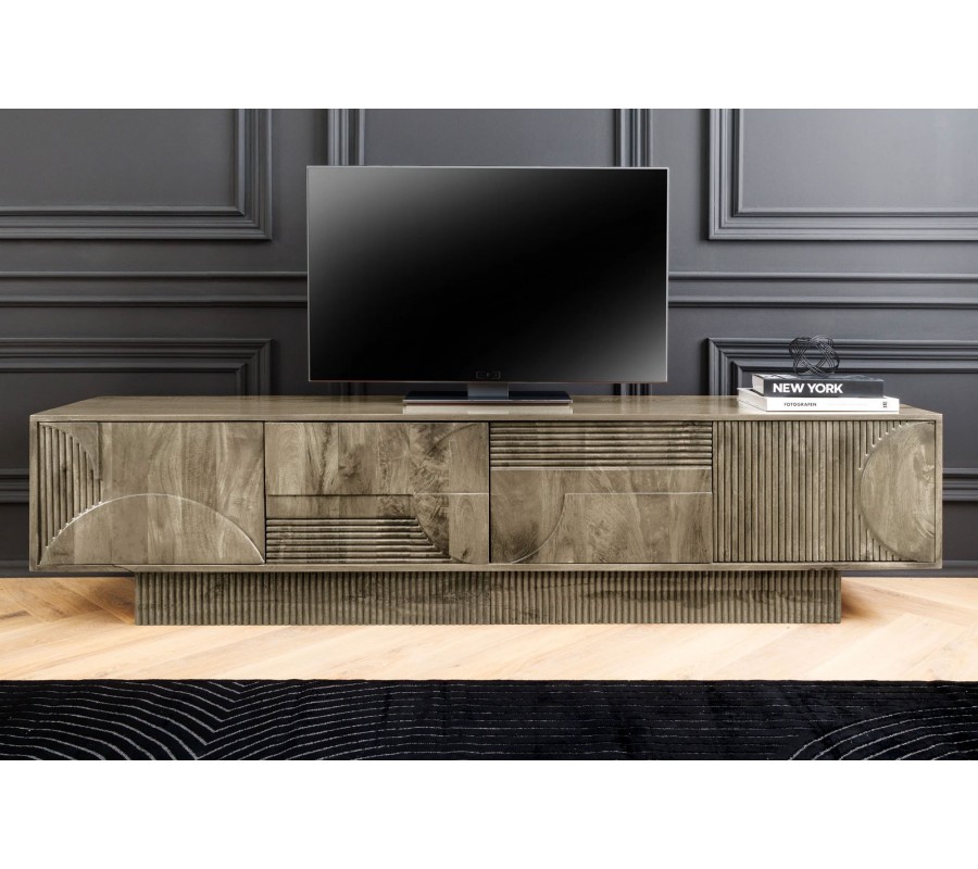 Masívny art deco TV stolík Sonia so štyrmi dvierkami s geometrickým vyrezávaným zdobením v sivej farbe 200 cm