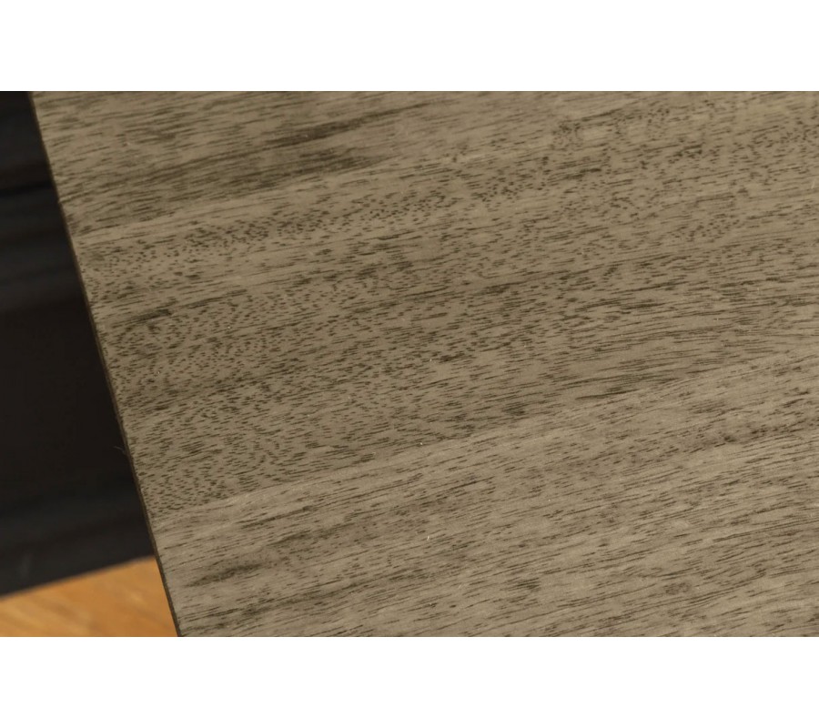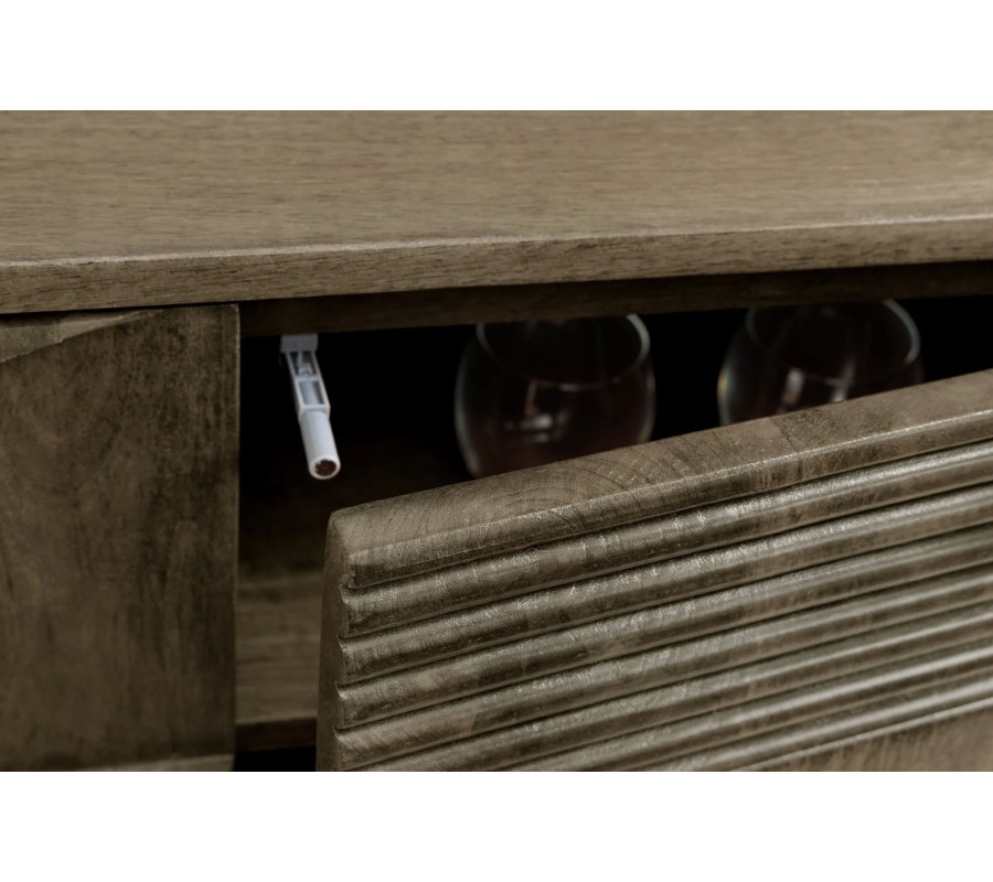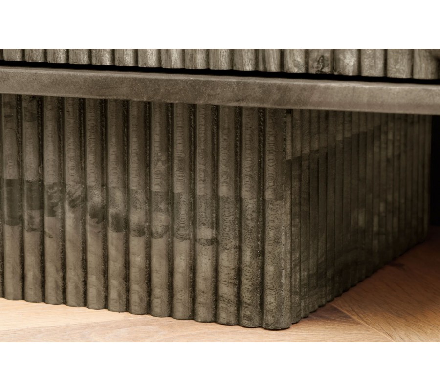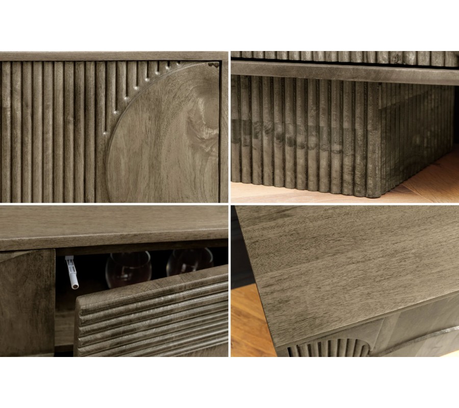 Televízny stolík je vyrobený z masívneho mangového dreva, ktoré mu zaručuje výbornú pevnosť a odolnosť. Povrchová úprava v sivej farbe pôsobí sofistikovane a zároveň necháva priznanú kresbu letokruhov, pripomínajúcu organický pôvod materiálu.