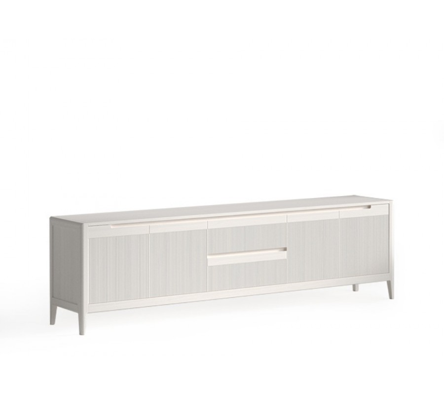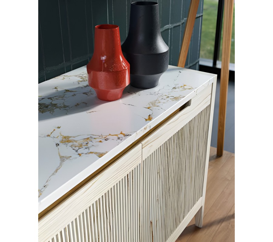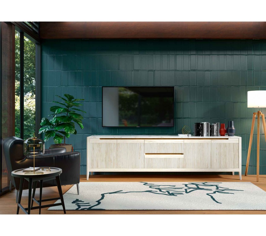 Luxusný moderný štvordverový TV stolík Tallin s vrúbkovaným čelom s mramorovou doskou 231 cm