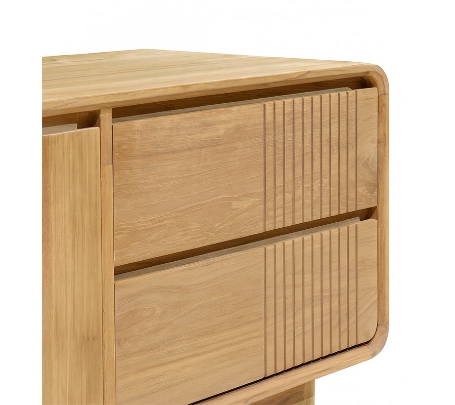 Televízny stolík je vyrobený z masívneho teakového dreva, ktoré je mimoriadne obľúbené vďaka svojej vysokej kvalite a odolnosti voči vplyvom prostredia a používania. Jeho svetlá hnedá farba s jemnou kresbou letokruhov pôsobí prírodným dojmom a prinesie do priestoru pocit tepla.