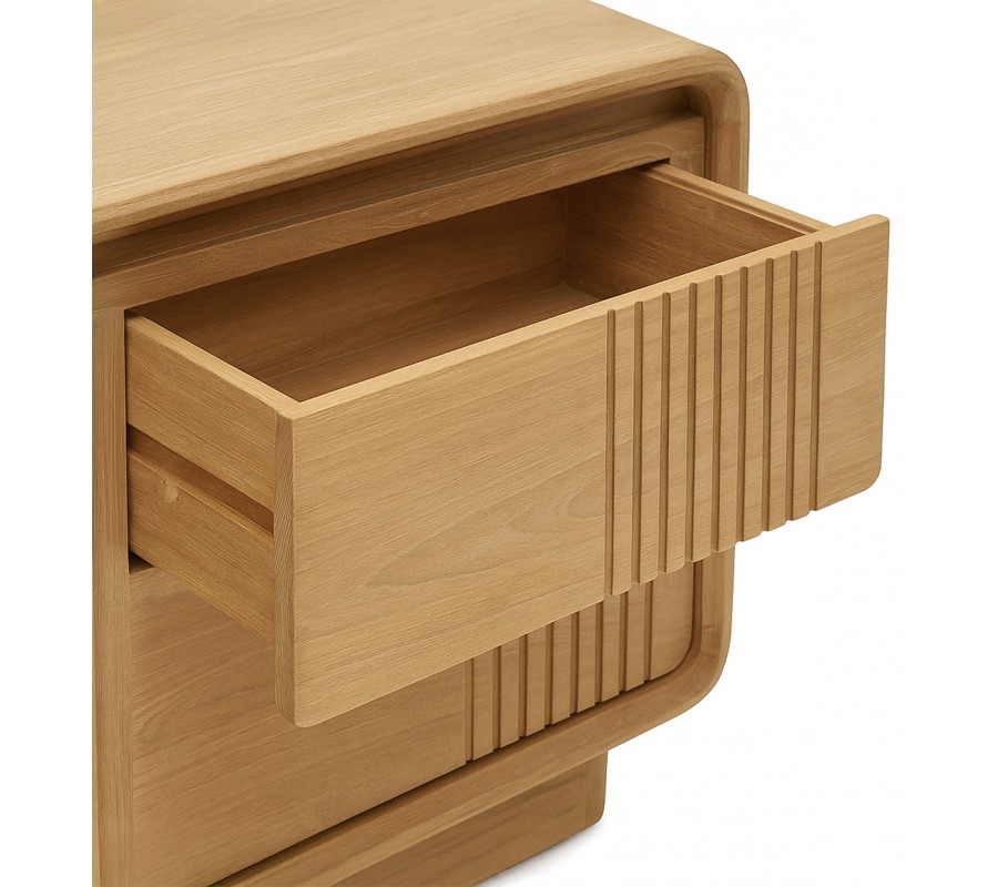 Interiér skrinky je predelený jednou policou a poskytuje tak dostatok priestoru na elektroniku, dokumenty či osobné predmety. Krajné dvierka zdobí vyrezávaný reliéf v podobe minimalistických rovných vertikálnych línií. Opakuje sa aj na opačnej strane, kde v užšom páse prechádza cez čelá zásuviek. S geometrickým zdobením výborne korešponduje aj dizajn bez úchytiek, ktorý pôsobí moderným dojmom.