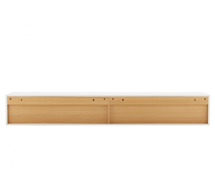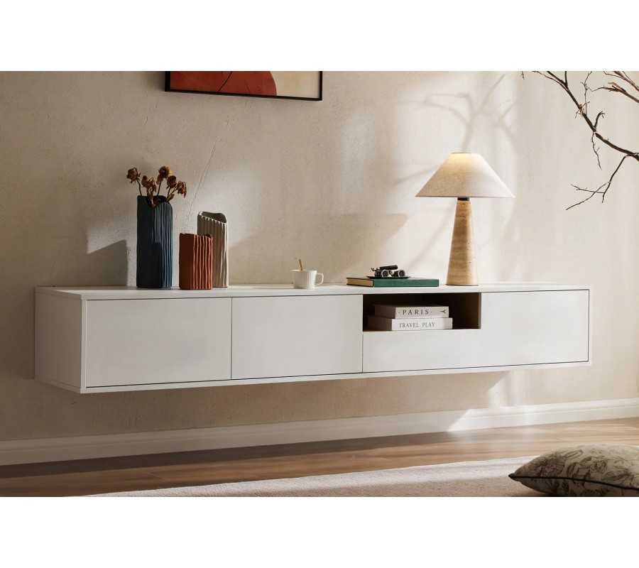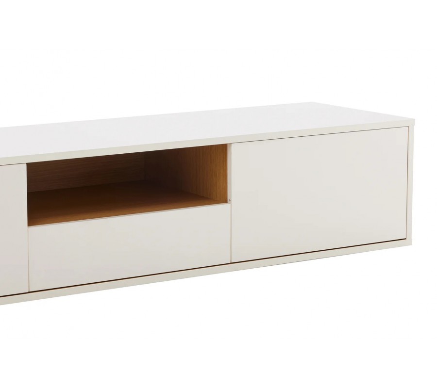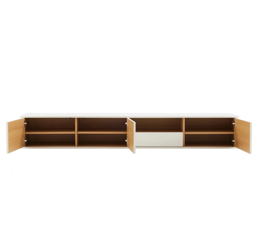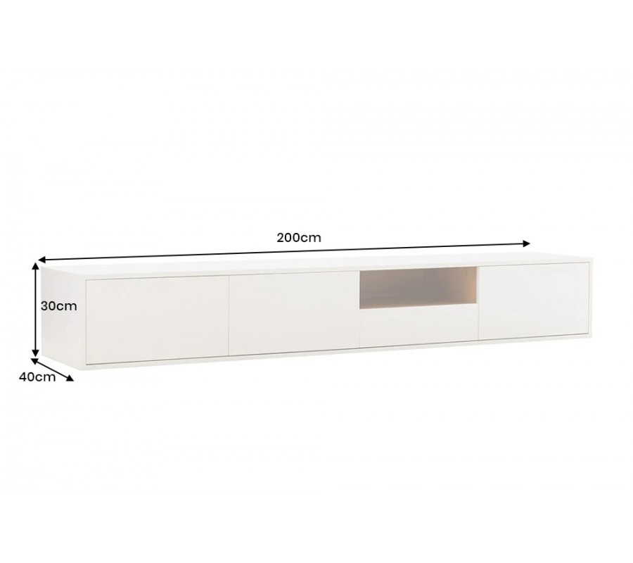 Škandinávsky nástenný obdĺžnikový trojdverový TV stolík Attica z dreva v bielej farbe so zásuvkou a policou 200 cm