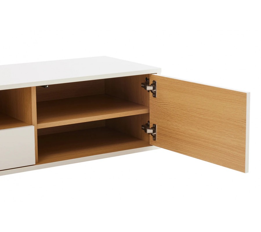 Na ľavej strane sa nachádza uzatvárateľná skrinka s dvomi dvierkami, ktorej vnútro je prakticky rozdelené vertikálnou doskou a dvomi policami. Tento priestor je ideálny na uloženie elektroniky, dokumentov alebo domácich doplnkov. Pravá časť stolíka ponúka skrinku s jednými dvierkami a jednou policou, doplnenú o zásuvku a otvorenú policu nad ňou, ktorá je vhodná na prehrávače, herné konzoly či dekoračné predmety. Čierne vnútro stolíka vytvára elegantný kontrast s bielym exteriérom a dodáva nábytku moderný, sofistikovaný akcent.