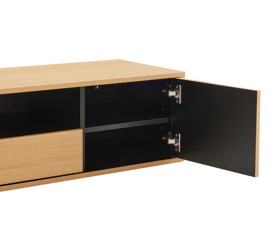 Moderný škandinávsky TV stolík Attica s dubovou dyhou je elegantným a praktickým riešením pre súčasné obývacie priestory, kde sa kladie dôraz na jednoduchosť, funkčnosť a prirodzené materiály. Obdĺžnikový tvar a čisté línie pôsobia nadčasovo a ľahko, pričom teplý dubový dekor vnáša do interiéru pocit útulnosti a prirodzenej harmónie. Skrinky sú umiestnené na oboch krajoch stolíka a každá z nich ukrýva jednu policu, vhodnú na uloženie elektroniky, doplnkov či dokumentov. V strednej časti sa nachádza zásuvka a nad ňou otvorená polica, ideálna na médiá, herné konzoly alebo dekorácie. Čierne vnútro stolíka vytvára moderný kontrast k svetlému drevenému vzhľadu a dodáva nábytku sofistikovaný detail.