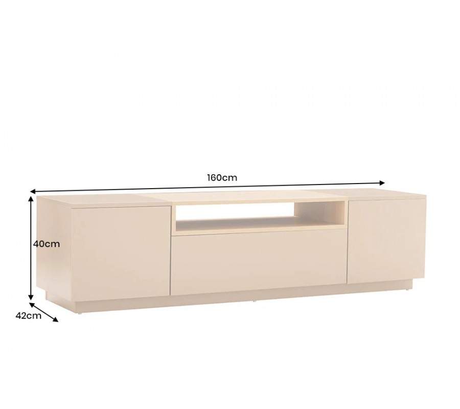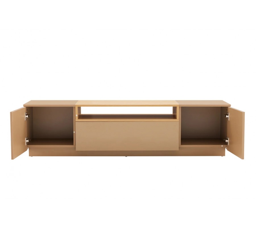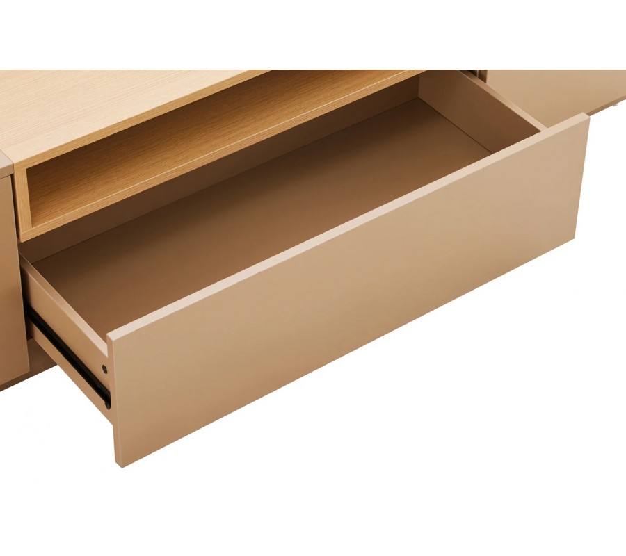 Na oboch krajoch stolíka sa nachádzajú uzatvárateľné skrinky, ktoré poskytujú dostatok priestoru na uloženie príslušenstva, médií alebo dokumentov. V strednej časti je praktická zásuvka a nad ňou otvorená polica, vhodná na knihy, dekorácie či zariadenia, ktoré chcete mať poruke. Vnútro stolíka je v hnedom prevedení, vďaka čomu pôsobí celok harmonicky a farebne zjednotene.