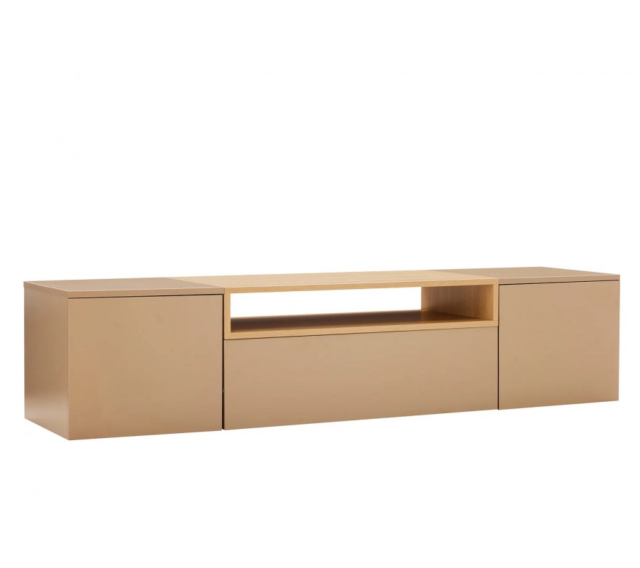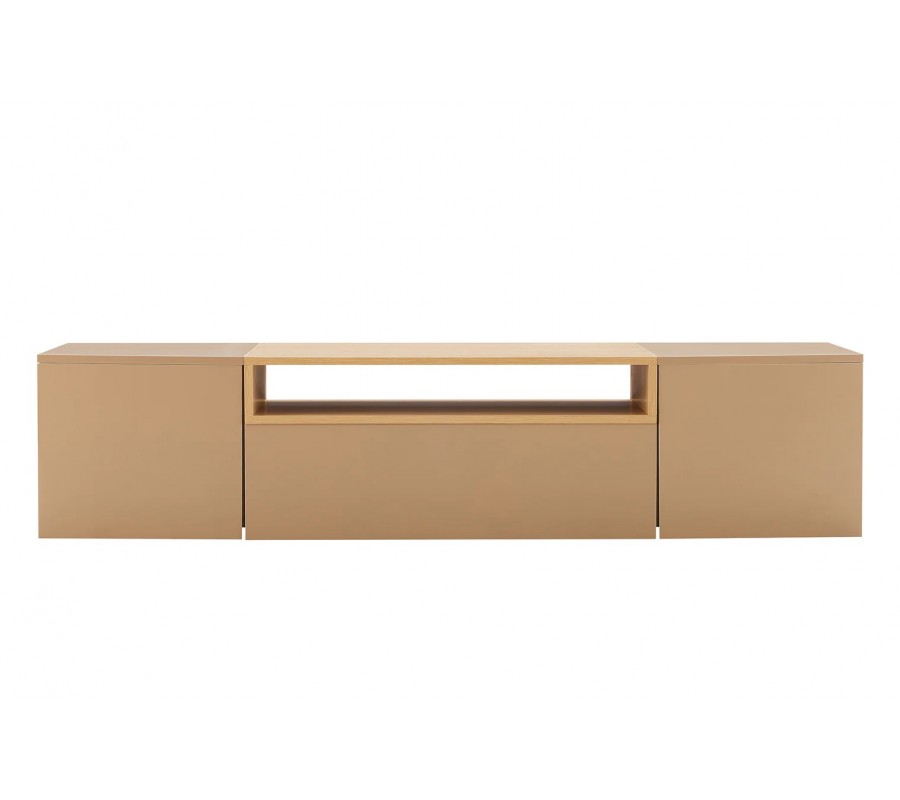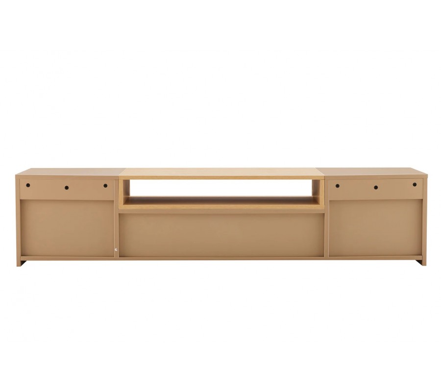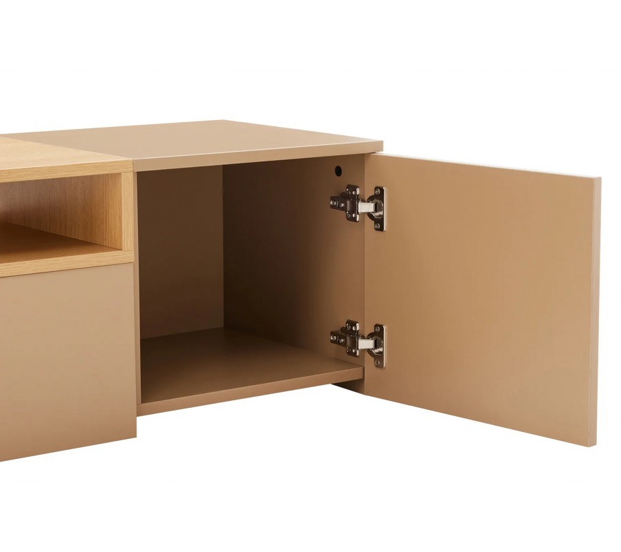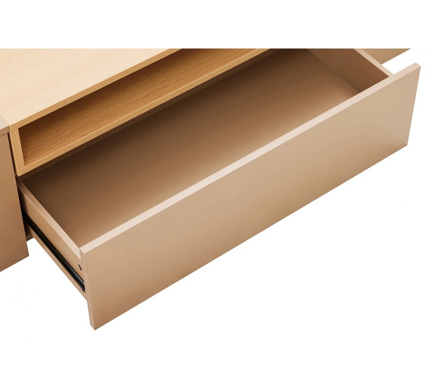 Na oboch krajoch stolíka sa nachádzajú uzatvárateľné skrinky, ktoré poskytujú dostatok úložného priestoru na elektroniku, príslušenstvo alebo predmety, ktoré chcete mať skryté. V strednej časti je praktická zásuvka a nad ňou otvorená polica v dubovom vzhľade, ktorá nemá zadnú stenu. Toto riešenie je ideálne na vedenie káblov a umiestnenie zariadení, ako sú set-top boxy, herné konzoly či prehrávače, bez rušivého vizuálneho efektu. Vnútro stolíka je v hnedej farbe, čo zachováva jednotný a harmonický vzhľad celého nábytku.