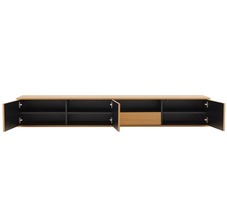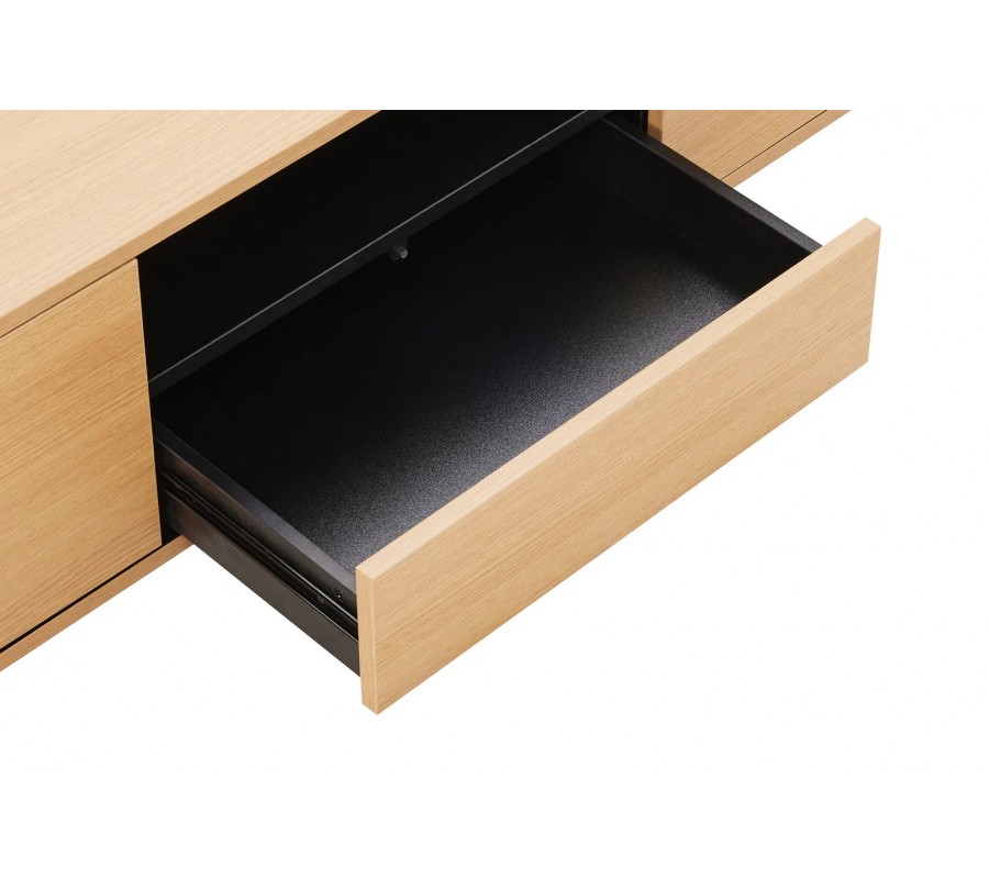 Na ľavej strane sa nachádza uzatvárateľná skrinka s dvomi dvierkami, ktorej vnútro je prakticky rozdelené vertikálnou doskou a dvomi policami. Poskytuje dostatok úložného priestoru na elektroniku, dokumenty alebo doplnky. Pravá časť stolíka ponúka skrinku s jednými dvierkami a jednou policou. Vedľa skrinky sa nachádza zásuvka a otvorená polica nad ňou, ideálna na médiá, herné konzoly či dekorácie. Čierne vnútro stolíka vytvára moderný kontrast k svetlému dubovému prevedeniu a dodáva celku sofistikovaný, súčasný vzhľad.