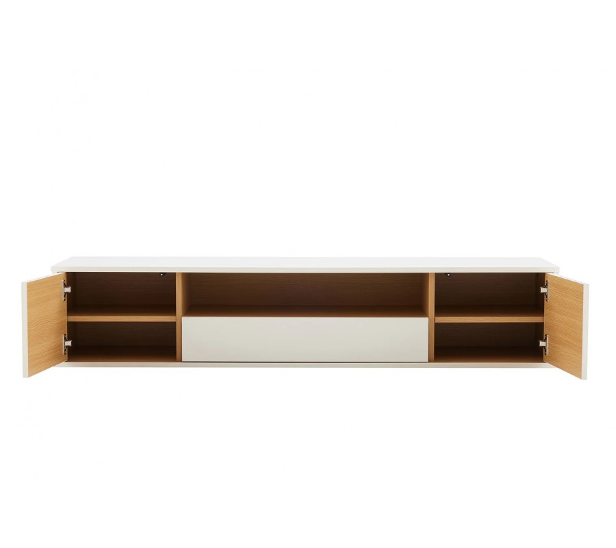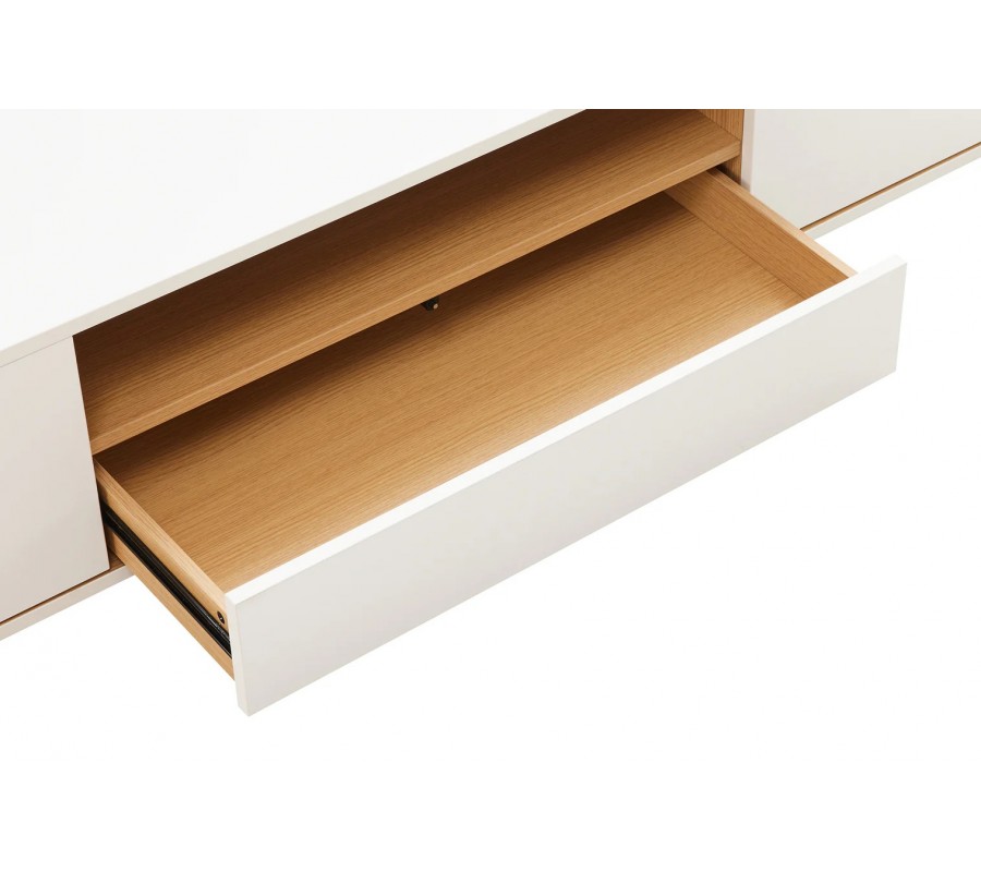 Na krajoch stolíka sa nachádzajú dve uzatvárateľné skrinky, z ktorých každá ukrýva jednu policu, vhodnú na uloženie elektroniky, dokumentov alebo drobných predmetov. V strednej časti sa nachádza praktická zásuvka a nad ňou otvorená polica s dubovou dyhou a zadnou stenou, ktorá je ideálna na uloženie médií, set-top boxu alebo dekorácií. Vnútorné plochy v dubovom dekore pôsobia útulne a dizajnovo prepracovane aj pri otvorených častiach stolíka.