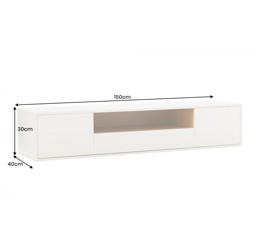 Moderný obdĺžnikový nástenný biely dvojdverový TV stolík Attica so zásuvkou a hnedou poličkou 150 cm