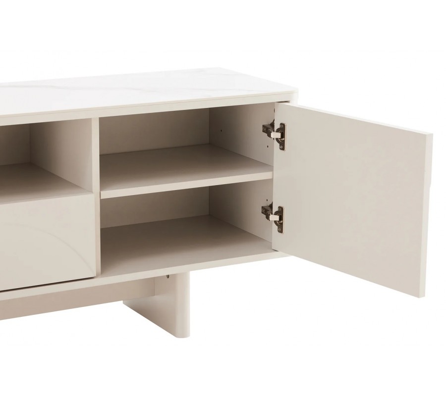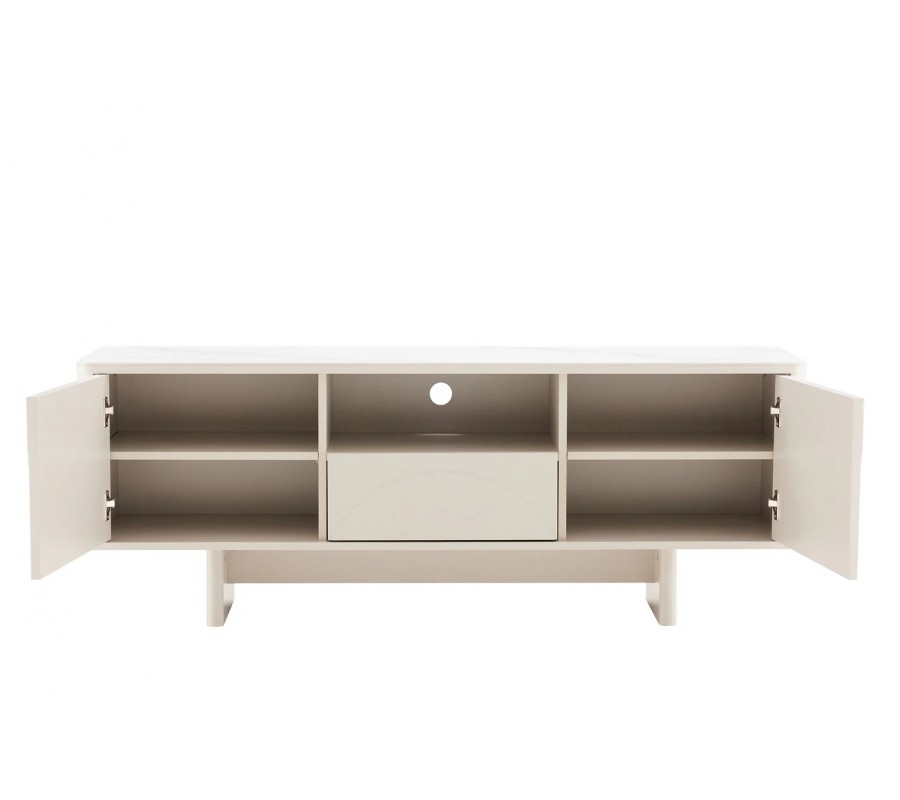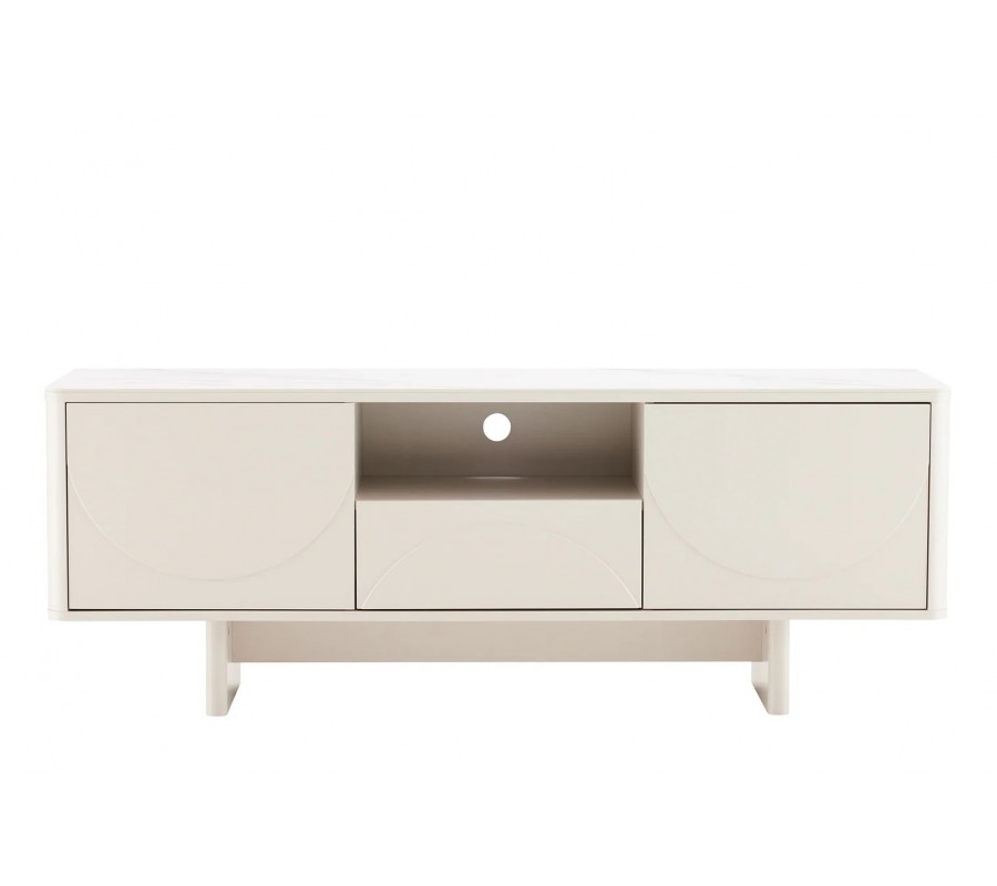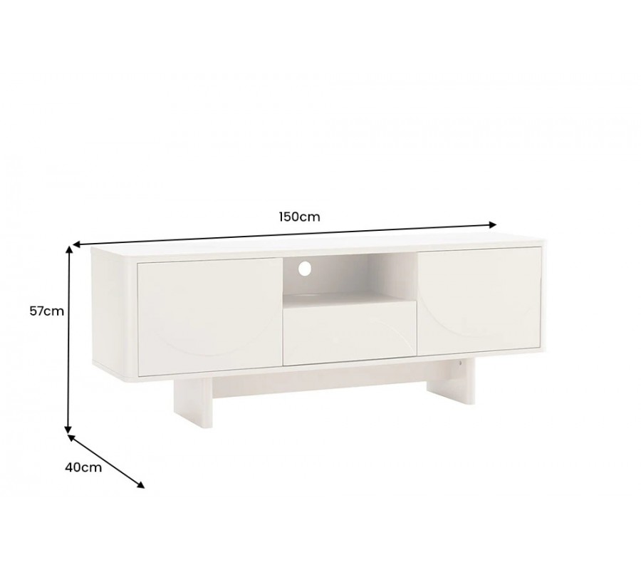 Televízny stolík má lineárnu obdĺžnikovú siluetu so zaoblenými hranami, ktoré dotvárajú elegantný vizuál. Podstava je vyššia a odľahčuje mohutný úložný priestor. Tvoria ju dve široké obdĺžnikové nohy prepojené spojnicou. V kombinácii s čistým bielym matným lakovaním tak nábytok pôsobí vzdušne a pomôže priestor presvetliť.