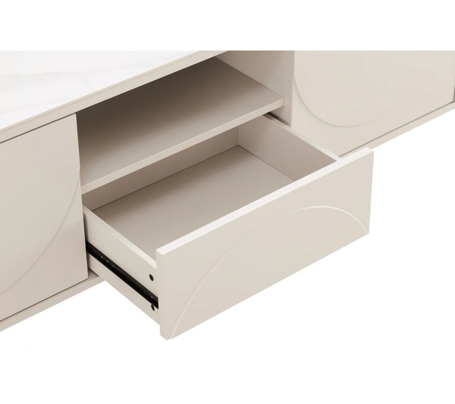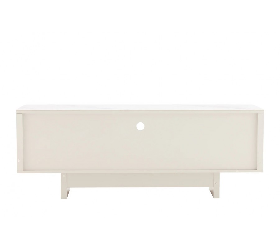 Dizajnový art deco dvojdverový TV stolík Savonia s policou a zásuvkou v bielej farbe s mramorovou doskou 150 cm