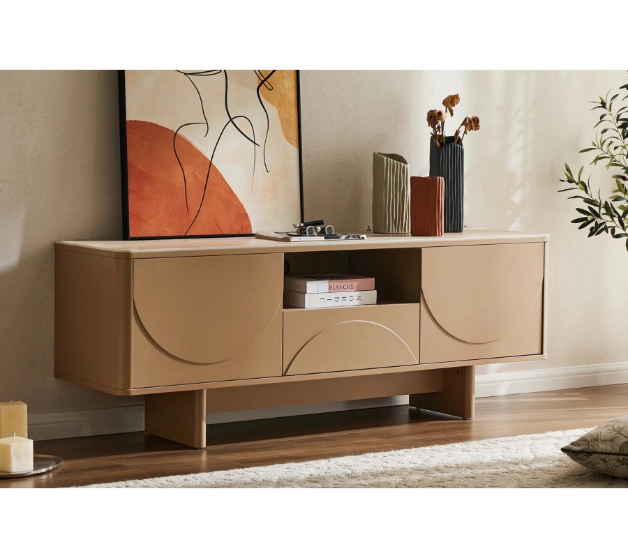 Televízny stolík Savonia sa hodí do modernej obývačky v zemitých odtieňoch, kde vynikne ako dekoratívny akcent. Môžete ho skombinovať s prírodnými materiálmi, ako mramor, drevo, ľan alebo vlna. Hodí sa tiež do priestorov zariadených v art deco štýle, k farebnej sedačke so zamatovým alebo buklé poťahom. Exkluzívny vizuál zdôraznia metalické zlaté doplnky.