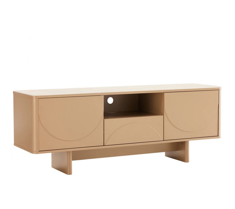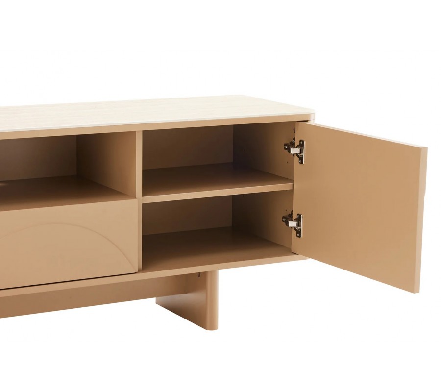 Dizajnový art deco TV stolík Savonia s úložným priestorom v hnedej farbe s travertínovou doskou a geometrickým reliéfom 150 cm