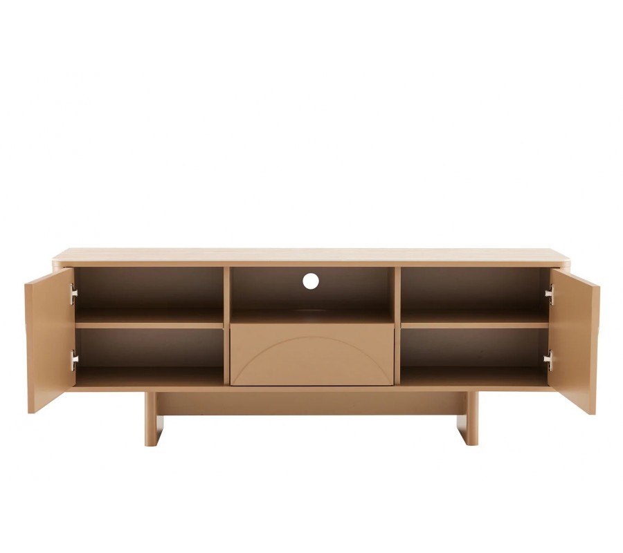 Televízny stolík Savonia zaujme svojím minimalistickým geometrickým zdobením s nádychom art deco štýlu a modernou siluetou. Prevedenie v hnedej farbe pôsobí teplým dojmom a oceníte aj bohatý úložný priestor.