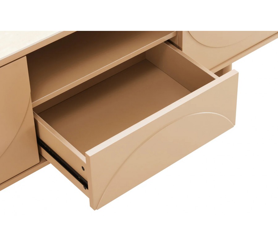 Dvierka a zásuvka majú moderný dizajn bez úchytiek a zdobí ich geometrický reliéf zložený z vyvýšených a zníženým plôch. Na každom úložnom priestore sa nachádza dizajn polkruhu, čo vytvára kompozíciu v art deco štýle.