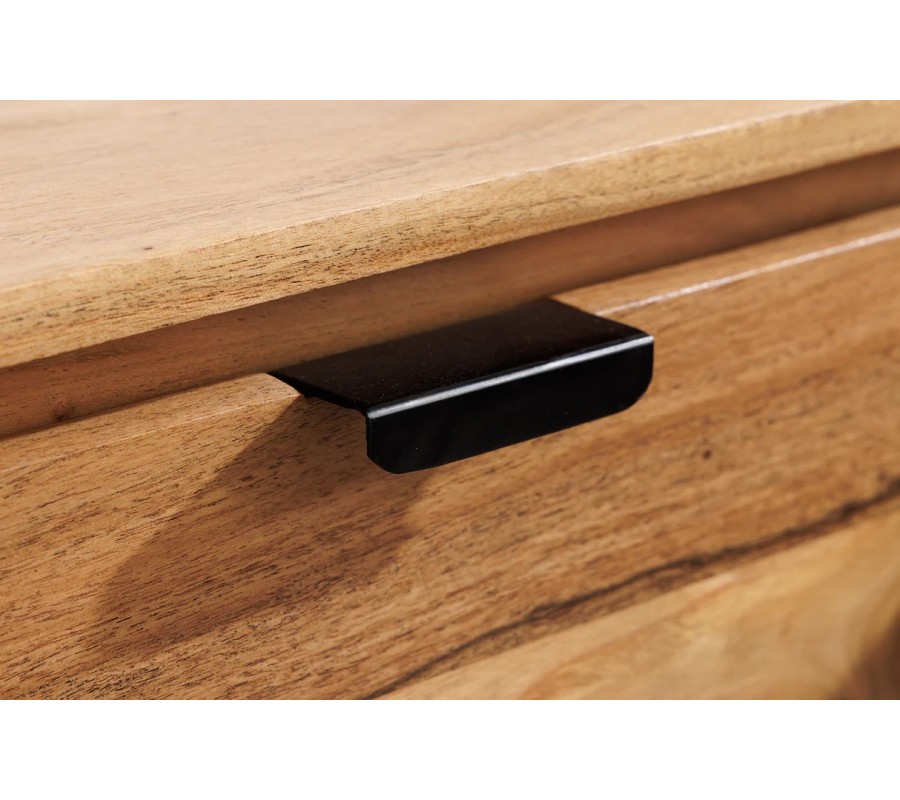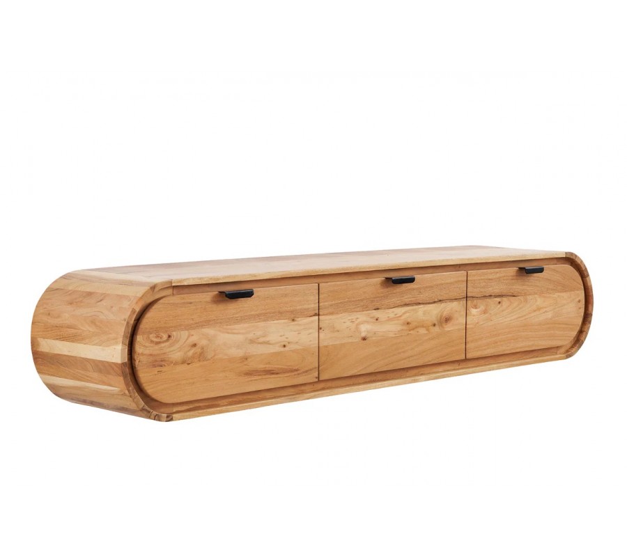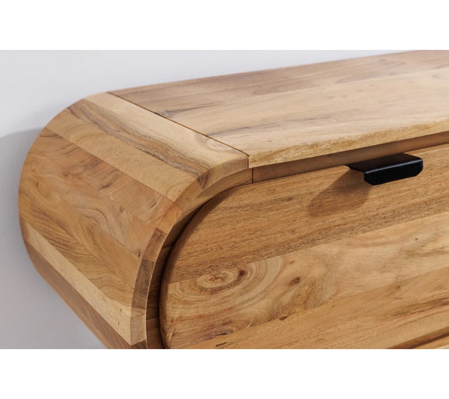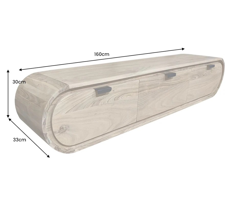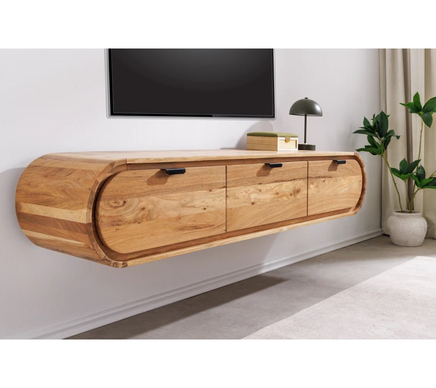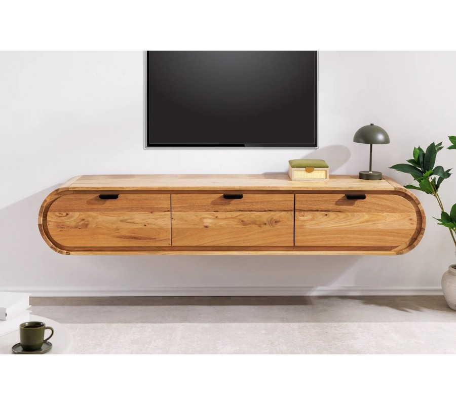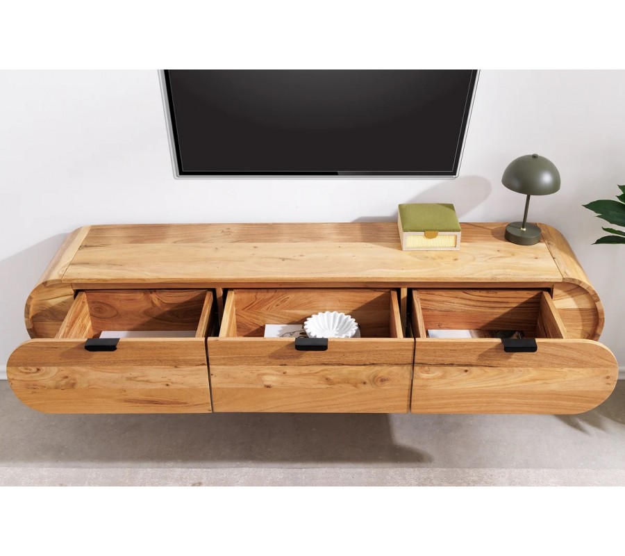 Charakteristickým prvkom stolíka sú zaoblené bočné steny, ktoré mu dodávajú mäkký, elegantný vzhľad a odlišujú ho od klasických hranatých TV stolíkov. Závesné vyhotovenie pôsobí vzdušne a odľahčuje priestor, zároveň uľahčuje údržbu podlahy. Praktický úložný priestor zabezpečujú tri zásuvky s podlhovastými čiernymi kovovými úchytkami, ktoré vytvárajú jemný industriálny kontrast k teplému tónu dreva.