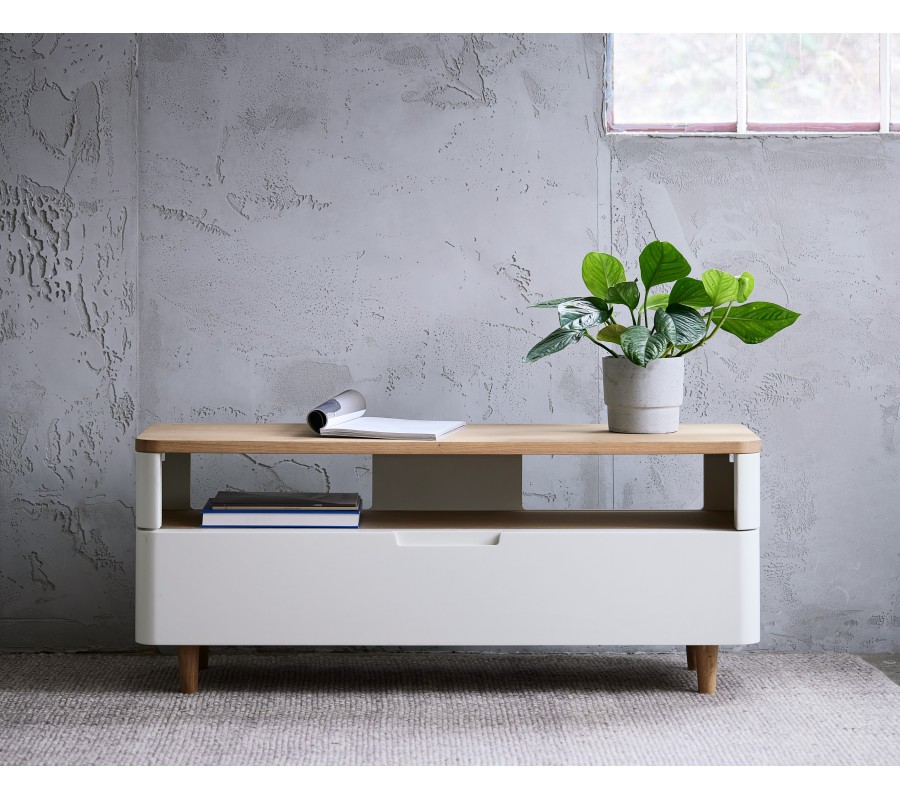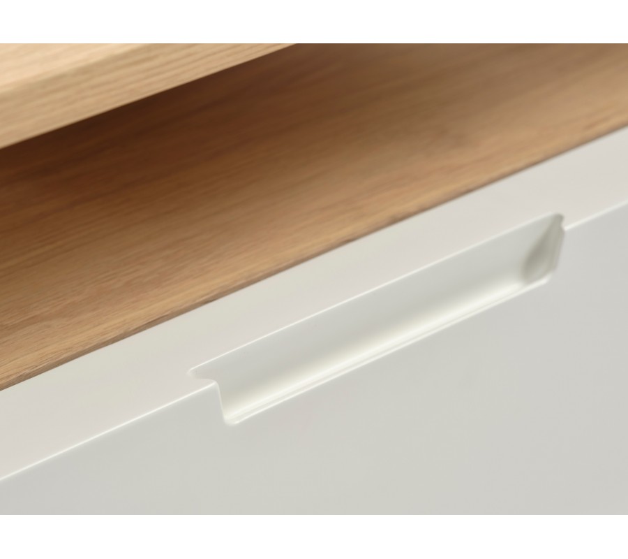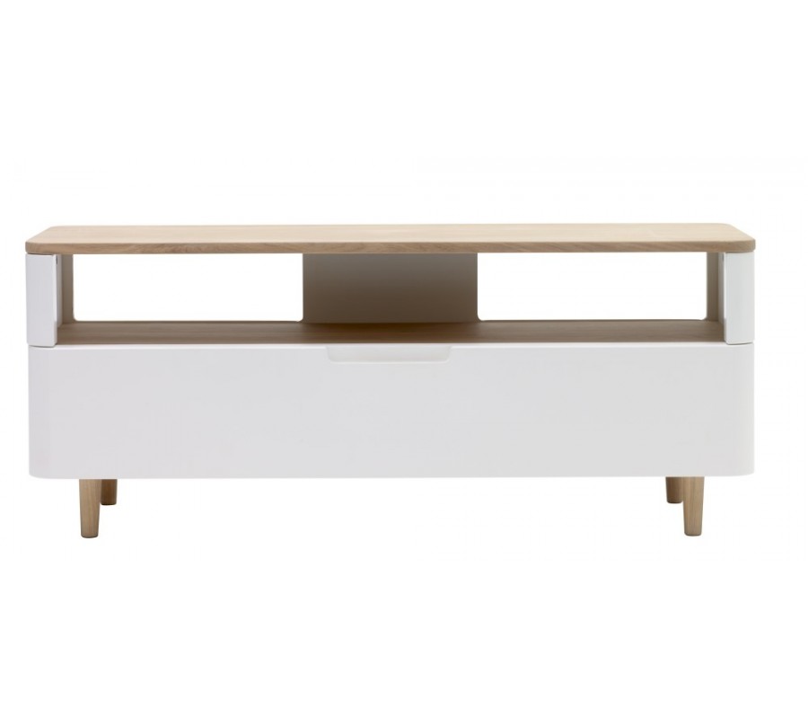 Dominantným prvkom stolíka je veľká zásuvka v bielej farbe, ktorá poskytuje dostatok miesta na uloženie ovládačov, káblov alebo ďalšieho príslušenstva k televízoru. Nad zásuvkou sa nachádza otvorený odkladací priestor vhodný napríklad pre set-top box, hernú konzolu alebo multimediálne zariadenia. Zadná stena je vybavená praktickými otvormi na vedenie káblov, vďaka čomu zostáva priestor okolo televízora prehľadný a uprataný.
