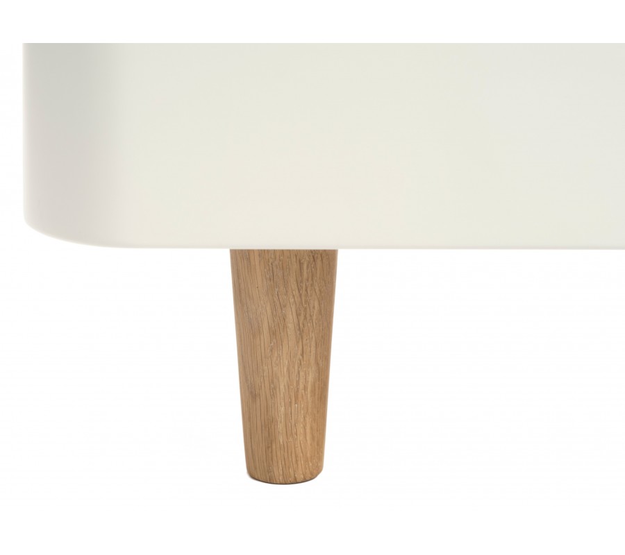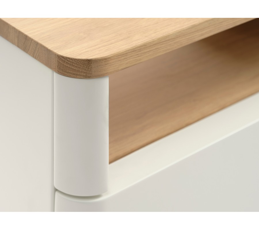 Korpus stolíka je vyhotovený z bielych melamínových dosiek, ktoré sa vyznačujú vysokou odolnosťou voči vlhkosti, teplu a oderu. Vrchná doska aj otvorená polica sú z dubovej dyhy v prirodzenej hnedej farbe, ktorá do interiéru prináša teplo a prírodný charakter. Stolík stojí na nižších drevených nožičkách v rovnakom dubovom odtieni, ktoré opticky odľahčujú celú konštrukciu a dodávajú nábytku typický škandinávsky výraz.