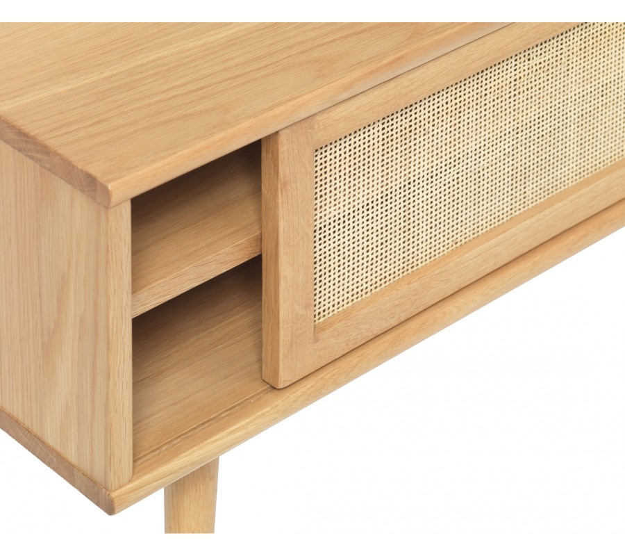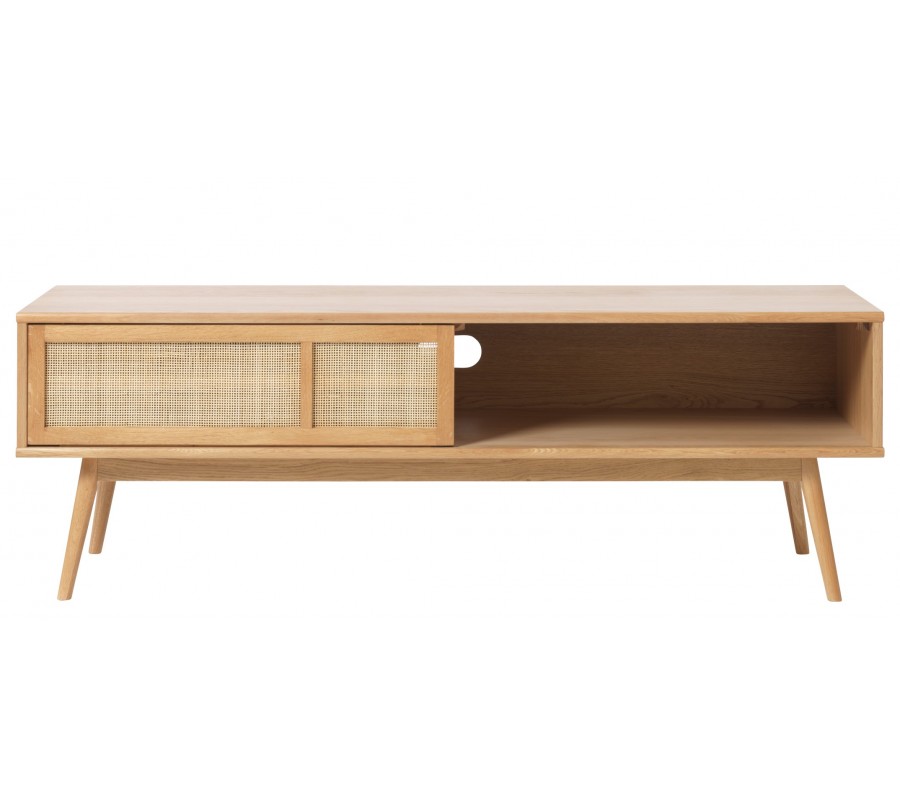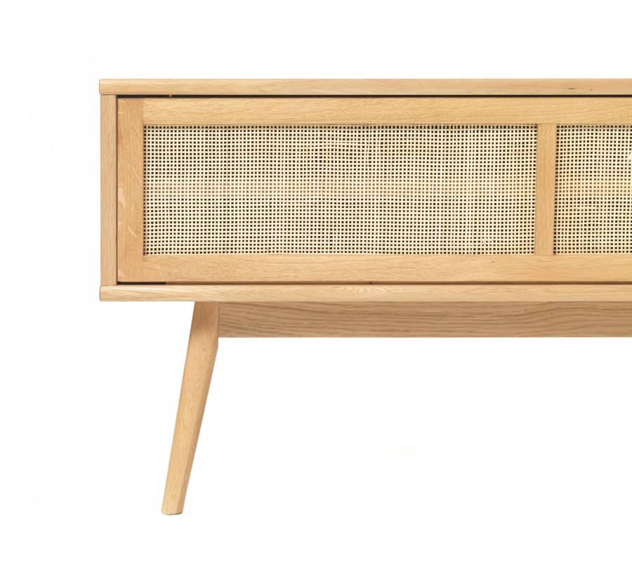 Škandinávsky TV stolík Aarhus v svetlom hnedom dubovom prevedení s posuvnými ratanovými dvierkami a policami 150 cm