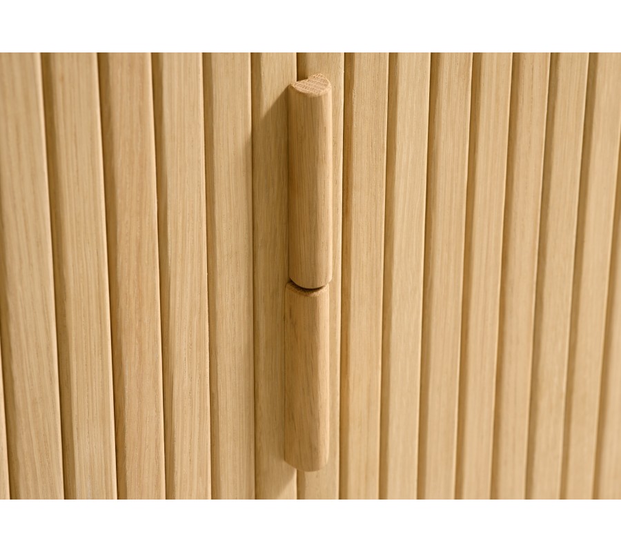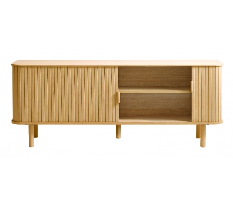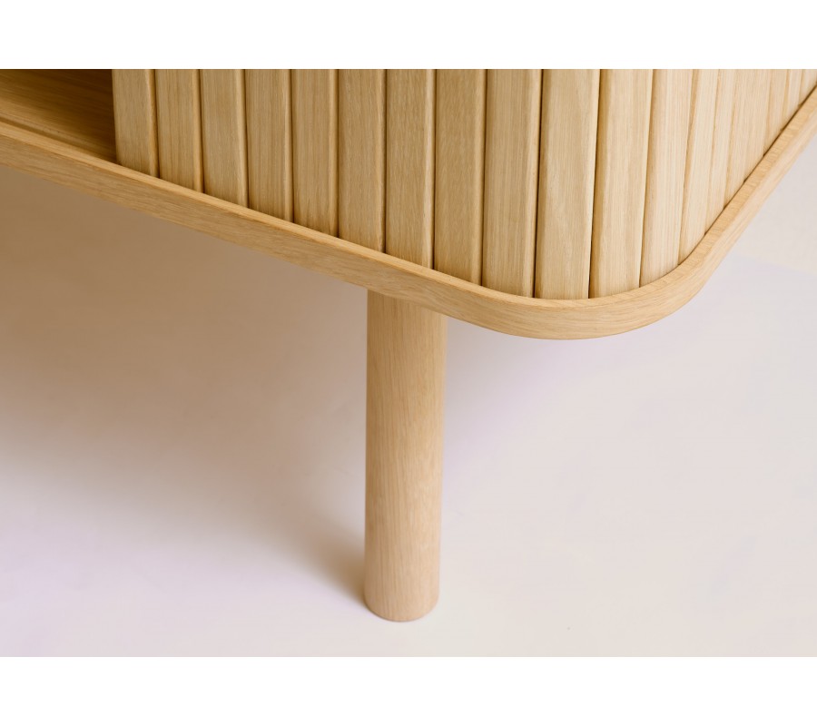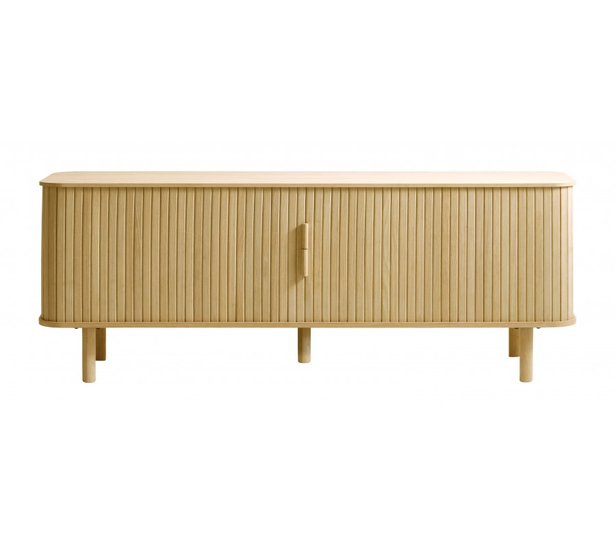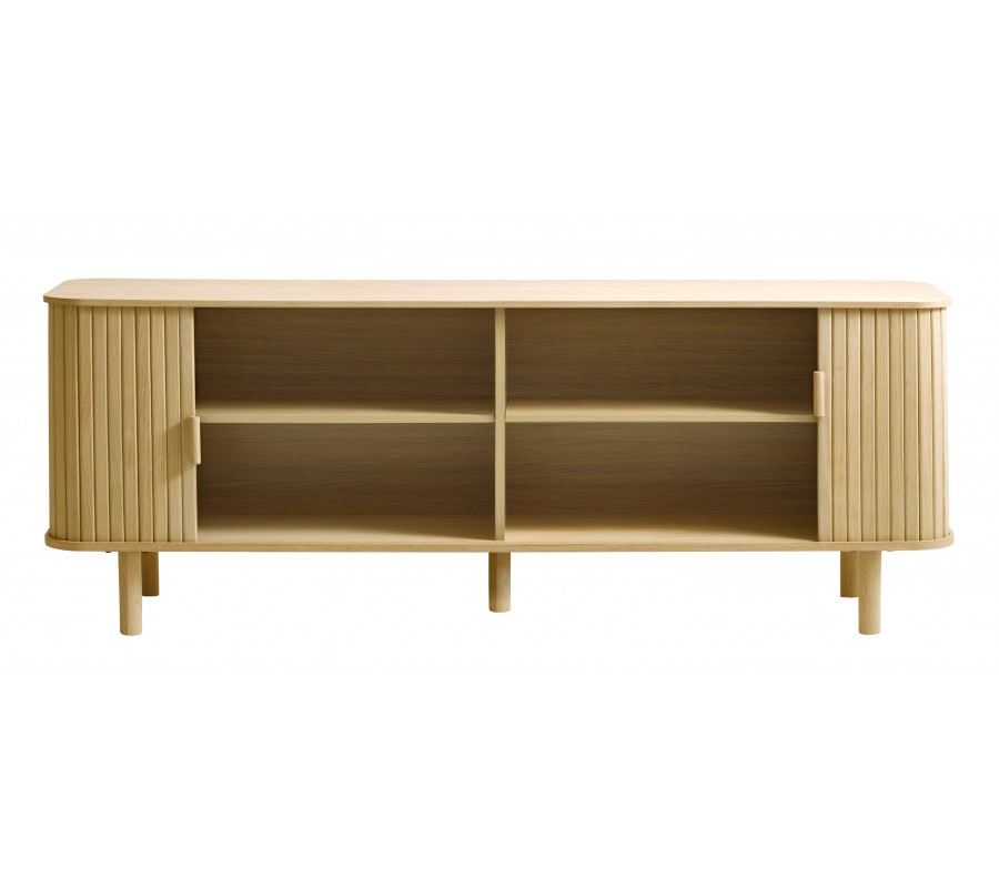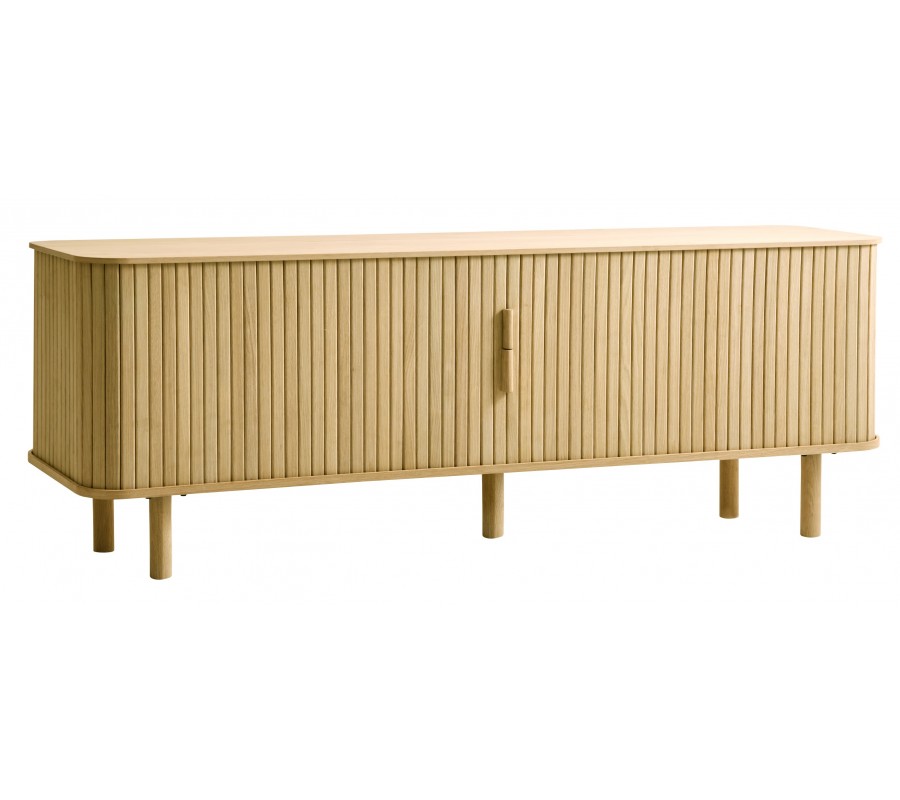 Luxusný škandinávsky dubový TV stolík Roskilde v svetlej hnedej farbe s posuvnými drážkovanými dvierkami 160 cm