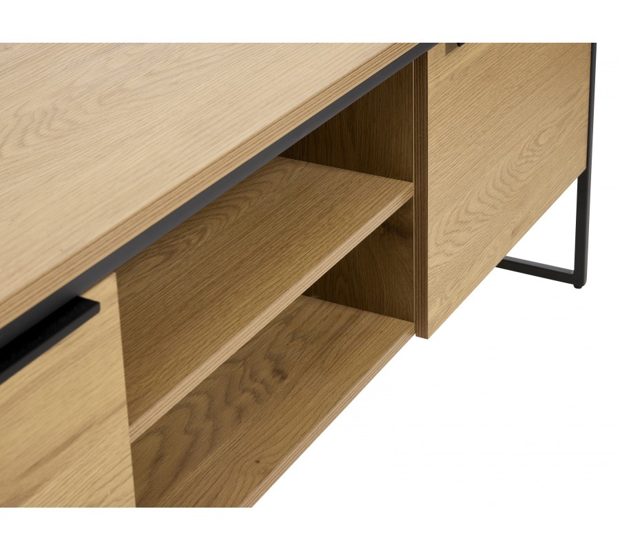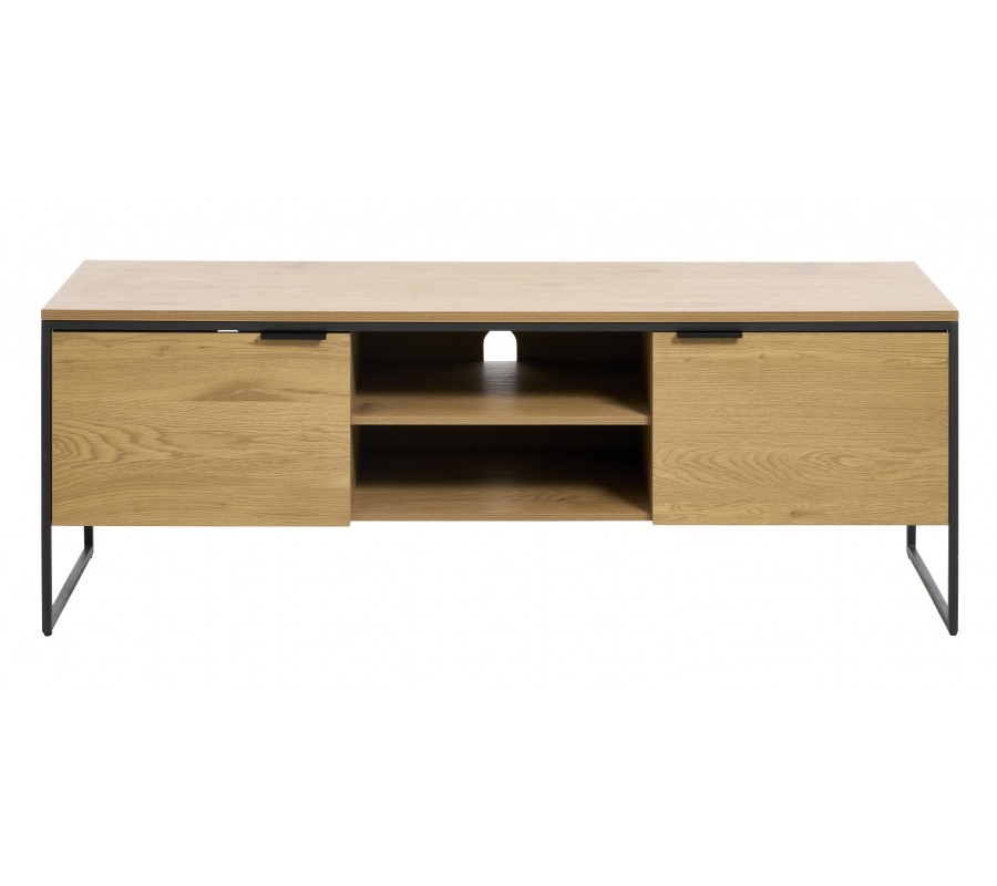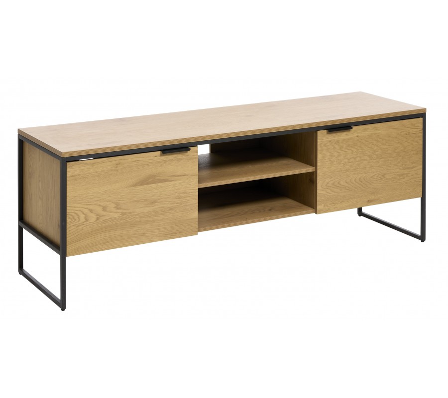 Moderný TV stolík Holstebro s dvomi dvierkami a policami v dubovom hnedom prevedení s čiernymi kovovými detailmi 155 cm