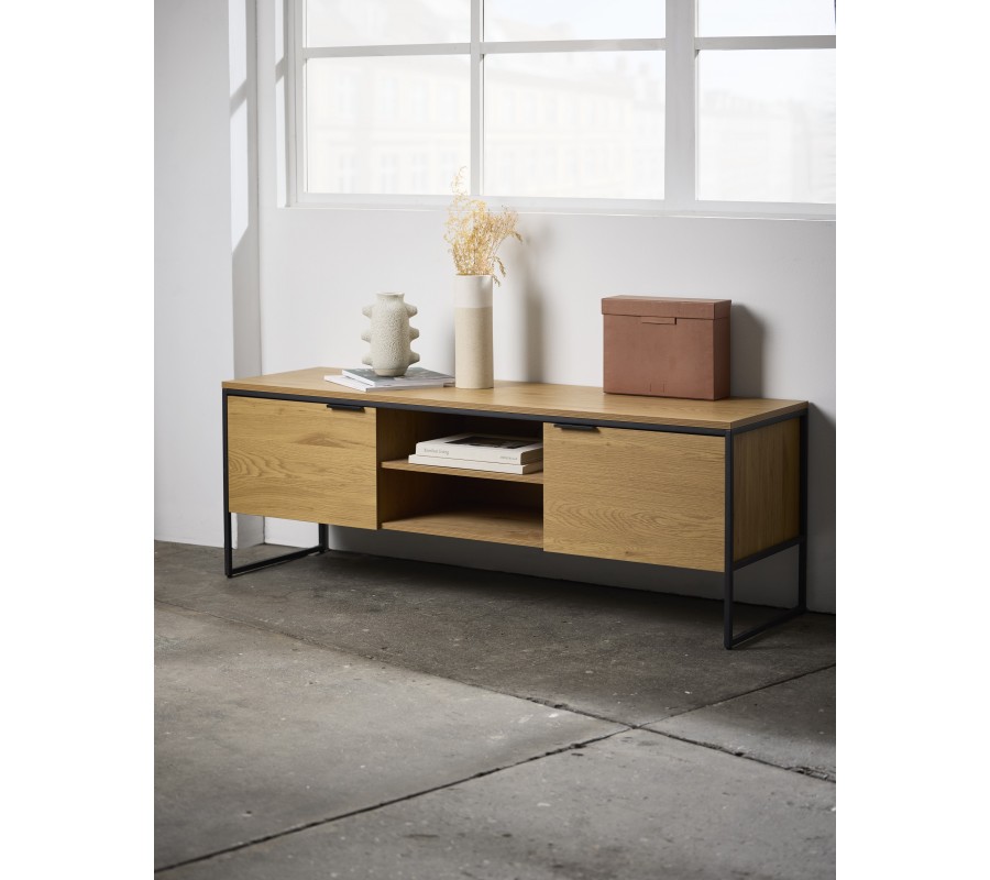 Televízny stolík Holstebro spája moderný minimalizmus a nádychom industriálnej estetiky. Oceníte tiež bohatý úložný priestor.