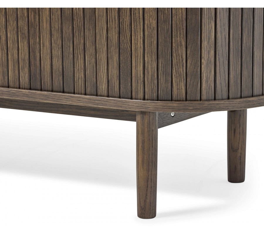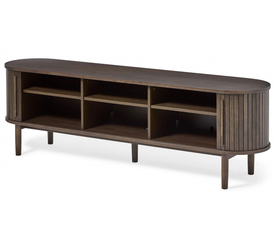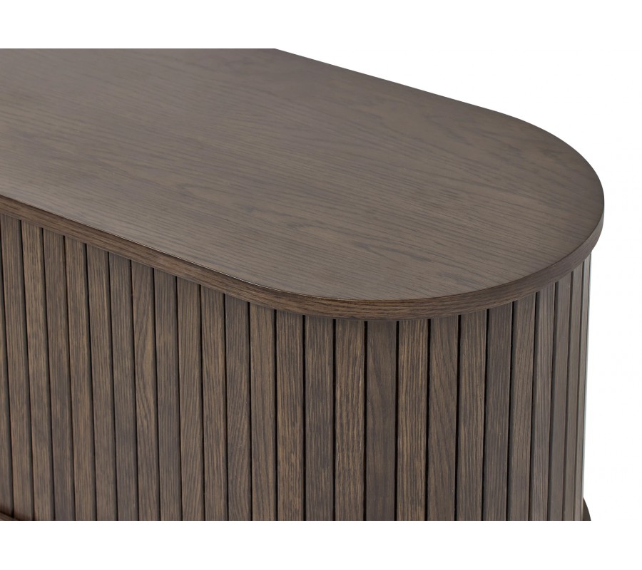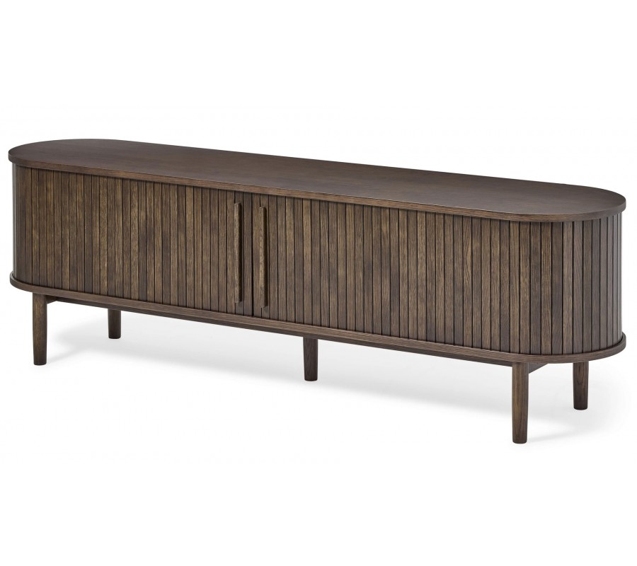 Retro oválny TV stolík Alborg s posuvnými lamelovými dvierkami v tmavom hnedom dubovom prevedení 180 cm
