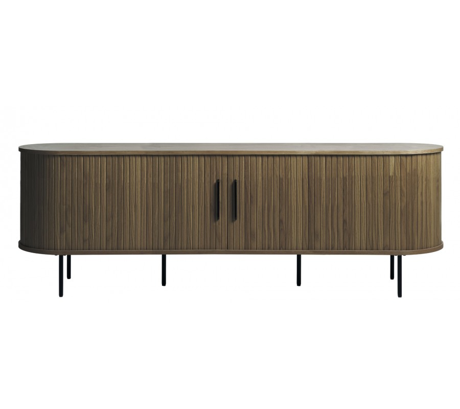 Retro oválny tmavý hnedý dubový TV stolík Bornholm s posuvnými lamelovými dvierkami a čiernymi kovovými detailmi 180 cm