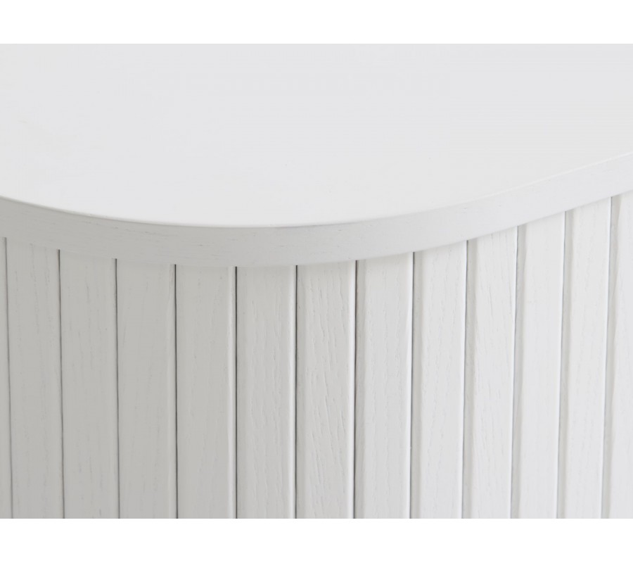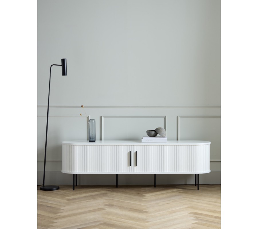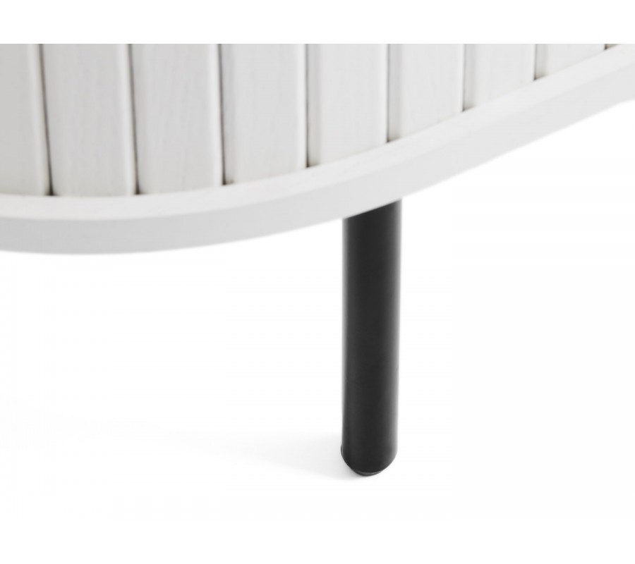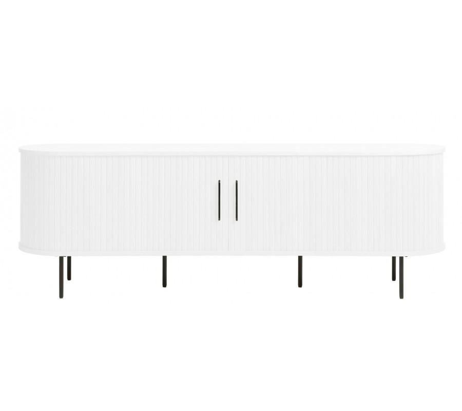 Moderný biely TV stolík Bornholm oválneho tvaru s posuvnými dvierkami s lamelovým dizajnom a čiernymi nohami z kovu 180 cm