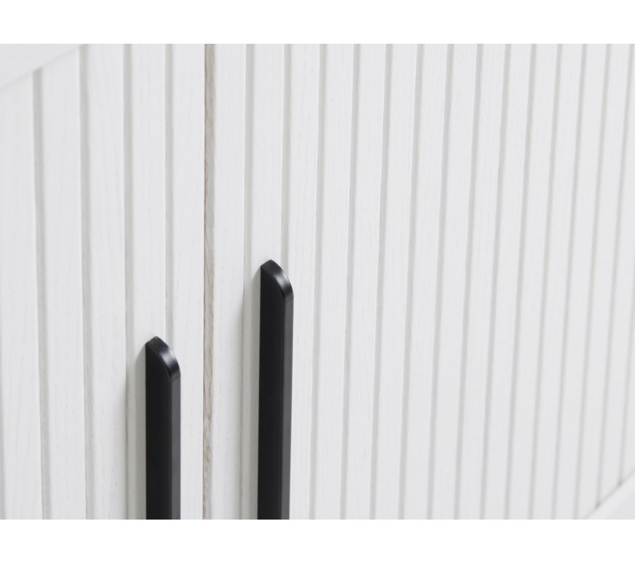 Stolík je vyrobený z pravej dubovej dyhy, kombinovanej s MDF. Povrchová úprava v bielej farbe zachováva priznanú jemnú štruktúru letokruhov dreva, ktorá vytvára príjemný prírodný akcent. Nožičky a úchytky sú vyrobené z kovu v matom čiernom prevedení a dodávajú nábytku moderný kontrastný prvok.