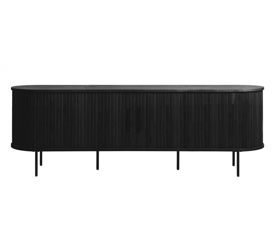 Moderný oválny televízny stolík Bornholm v čiernom dubovom prevedení s posuvnými dvierkami s lamelami a kovovými nohami 180 cm