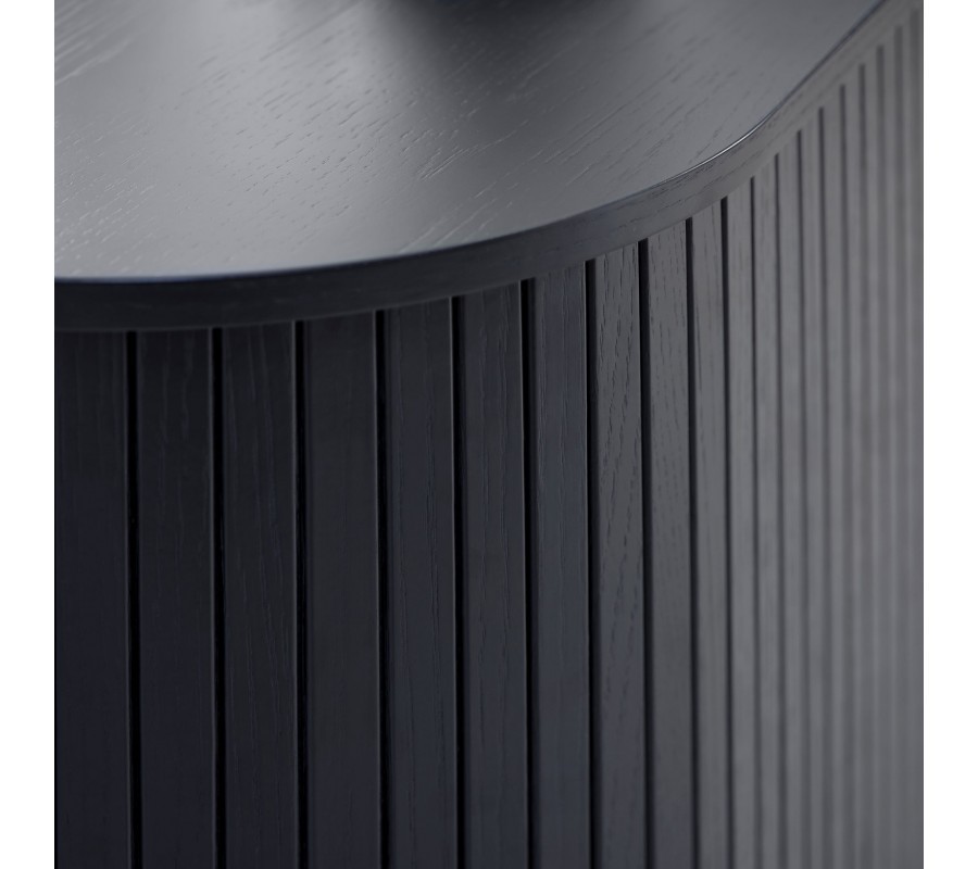 Stolík má minimalistickú oválnu siluetu, kde robustnejší korpus vyvažujú vyššie, štíhle nohy. Tie sú vyrobené z kovu v matnej čiernej farbe a ich valcovitý tvar harmonicky dopĺňa zaoblené línie celku. Štyri sú umiestnené na okrajoch a dodatočné dve v strede zadnej strany. Korpus z dubovej dyhy a MDF je lakovaný v čiernom odtieni, pričom si zachováva prirodzenú kresbu dreva, ktorá vytvára zaujímavý prírodný kontrast k modernému prevedeniu. Hladká vrchná doska oválneho tvaru poskytuje dostatok miesta nielen pre televízor, ale aj dekorácie či rastliny.