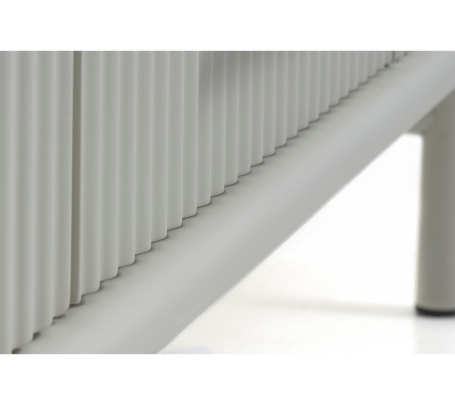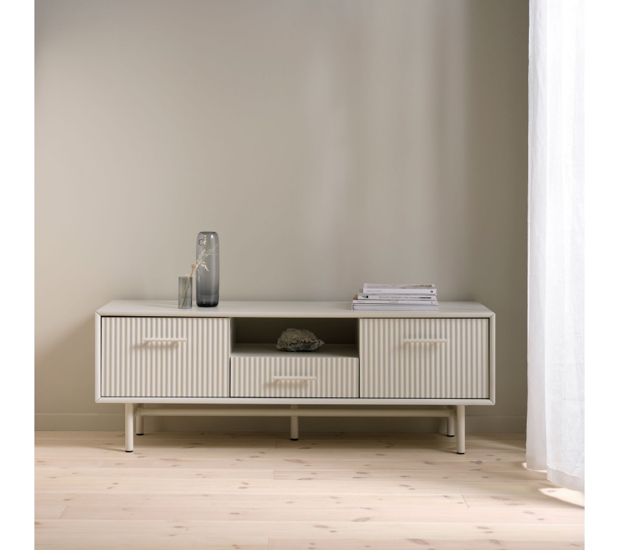 Art deco TV stolík Hvidea s dvomi dvierkami a zásuvkou s rebrovaným reliéfom a policou vo svetlej sivo béžovej farbe 140 cm